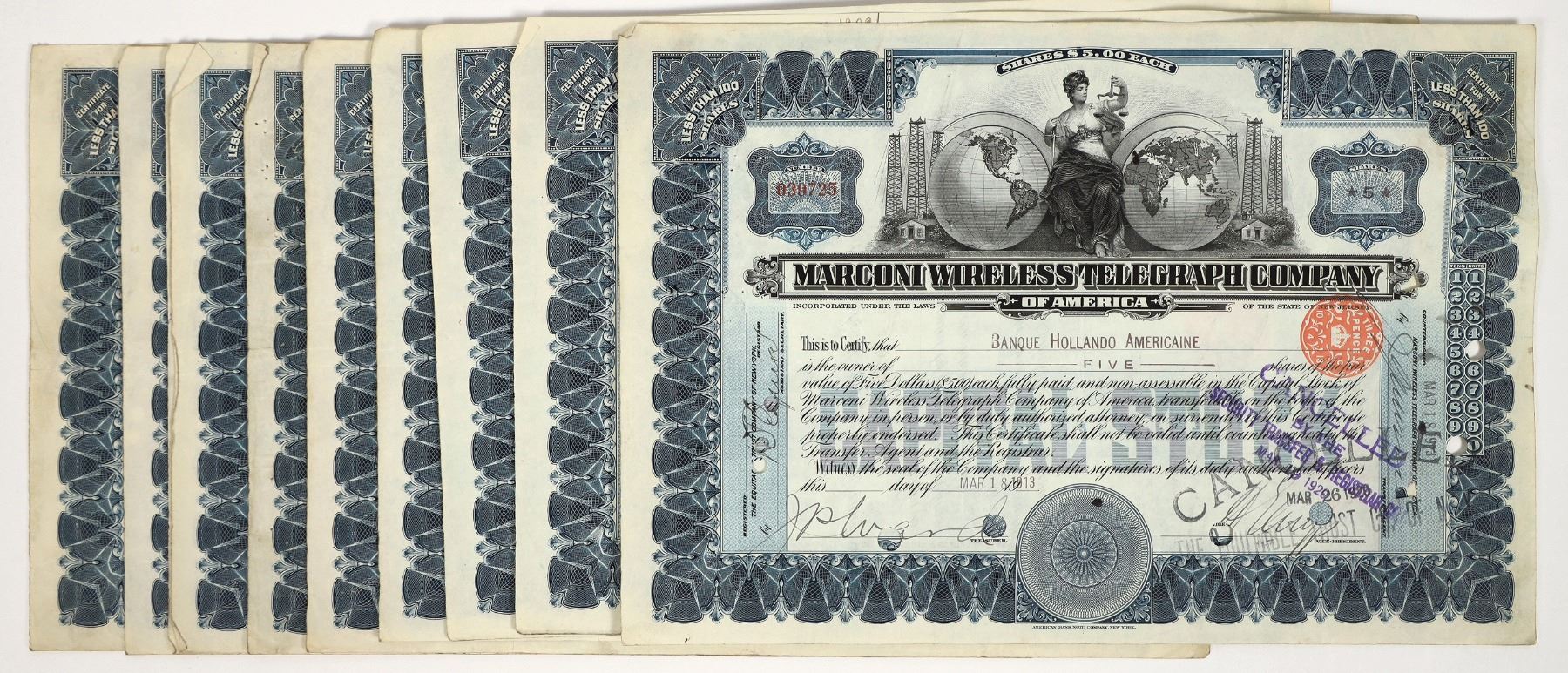 Lot of 10 stocks issued in 1913, cancelled. Blue border, black print, and allegorical vignette of woman with globes and telegraph towers. ABN. Foreign imprinted revenue stamps. The Marconi Wireless Telegraph Company of America was incorporated in 1899. It was established as a subsidiary of the British Marconi Company and held the U.S. and Cuban rights to Guglielmo Marconi's radio (then called "wireless telegraphy") patents.
