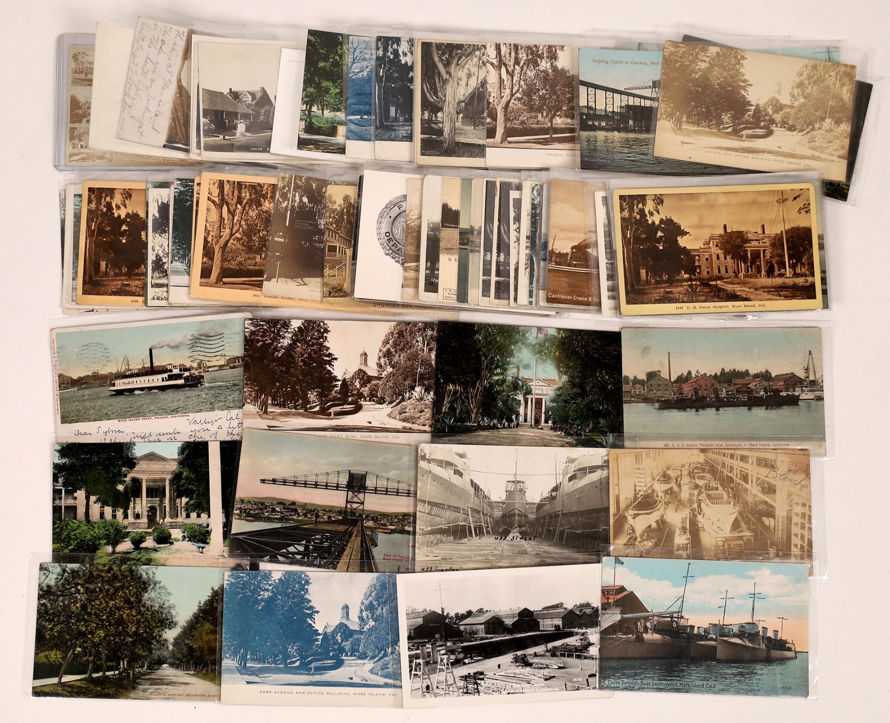 A vintage group of about 55 RPC's from Mare Island Naval Shipyard in Vallejo, California. Established in 1852 as the first Naval installation of the West Coast, Mare Island was key to protecting San Francisco and the Bay Area during WWII. It was decommissioned in 1996. These show the history of the yard through its history, featuring several buildings on the base as well as ships that went there for repairs in both World Wars. There is also a Mare Island pin back included in this lot. A very nostalgic and historic collection. Some used, some blank. Please see photos for more detail and condition. Date: 1900's Country (if not USA): State: California City: Vallejo Provenance: