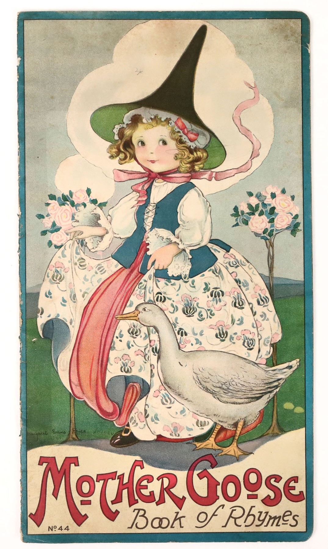 Mother Goose Book of Rhymes, a children's book illustrated by Margaret Evans Price, co-founder of Fisher-Price Toys. Copyright 1917 by Stecher Litho. Co., Rochester, N.Y. "No. 44" printed in bottom left corner of front cover. Softcover. 14 pp. with illustrations filling 3/4 of every page and the entire front and back covers. Light staining on cover, light foxing inside pages, spine wear with small separation near bottom, otherwise good. 7.5" x 14". Margaret Evans Price (1888 - 1973) co-founded Fisher-Price Toys in 1930 with her husband, Irving Price, and Herman Fisher. She was a children's book illustrator and artist. She became the first art director for Fisher-Price and designed push-pull toys for the opening line, based on characters from her children's books.