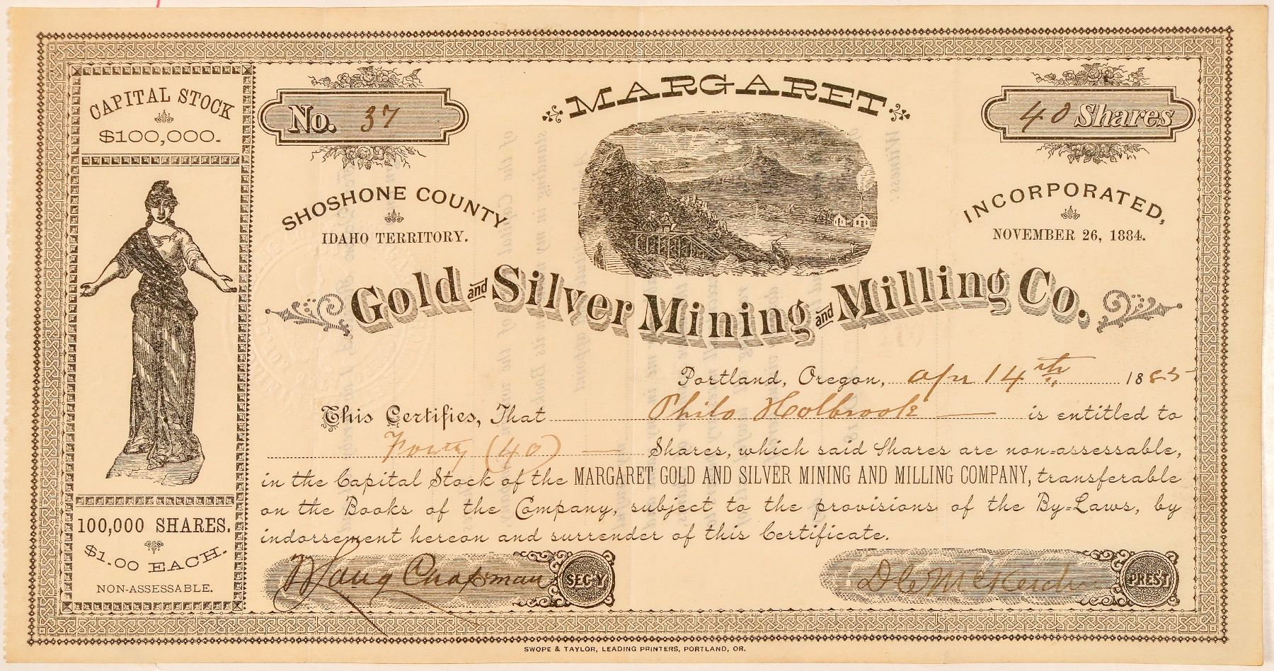 Shoshone County, Idaho Territory (printed to left of vignette). Inc. Nov. 1884. No. 37, issued for 40 shares to Philo Hoolbrook on Apr. 14th, 1885 in Portland, Oregon. Signed by president DC McKeichem (?) and secretary to Chapman. Not cancelled. Black border and print. Two vignettes: allegorical woman (left) and birds-eye of mine. Printed by Swope & Taylor, Portland. 5.5 x 10.5" Deep folds. Not in Filer or Holabird indexes. Ken Prag Collection