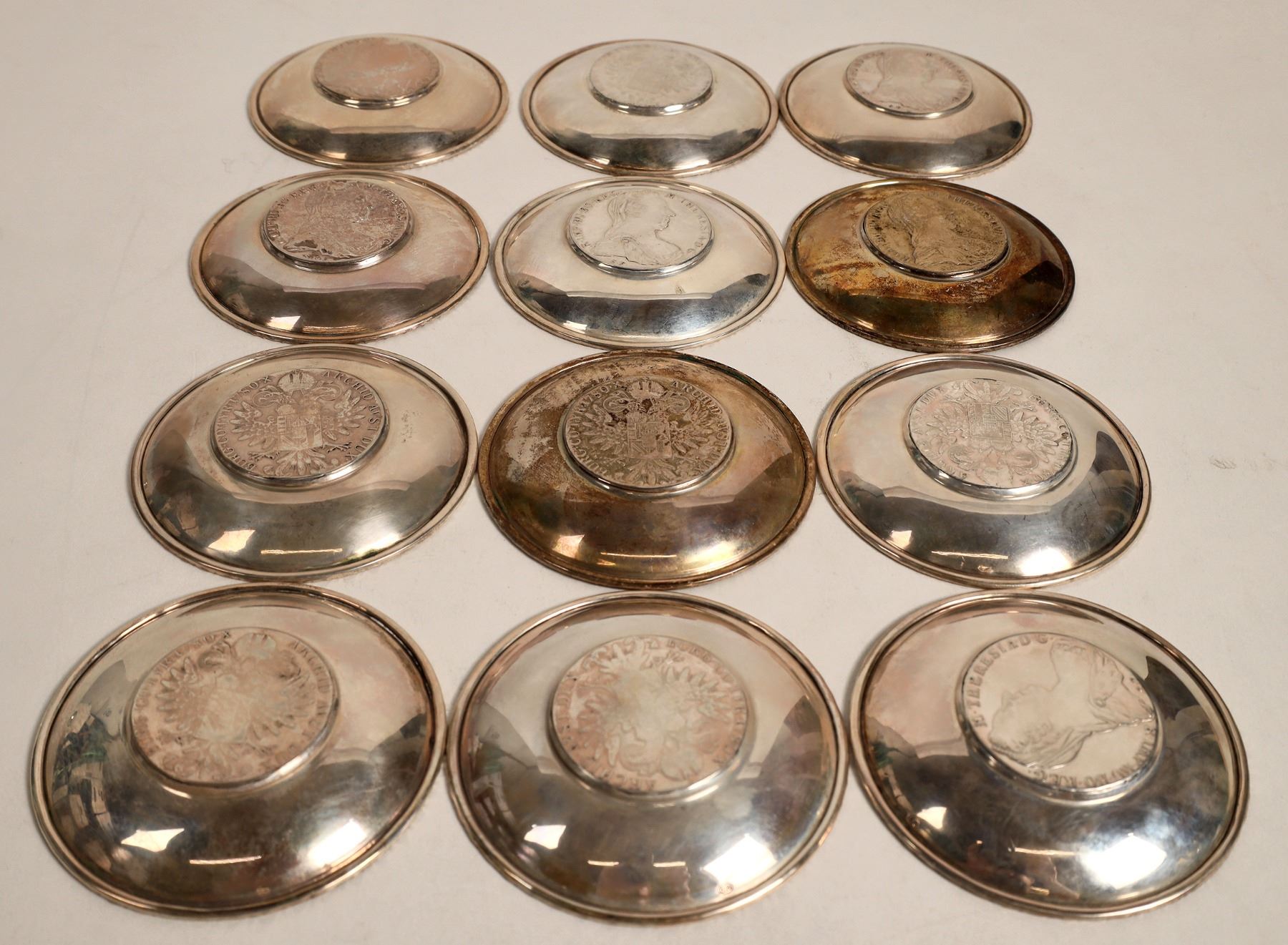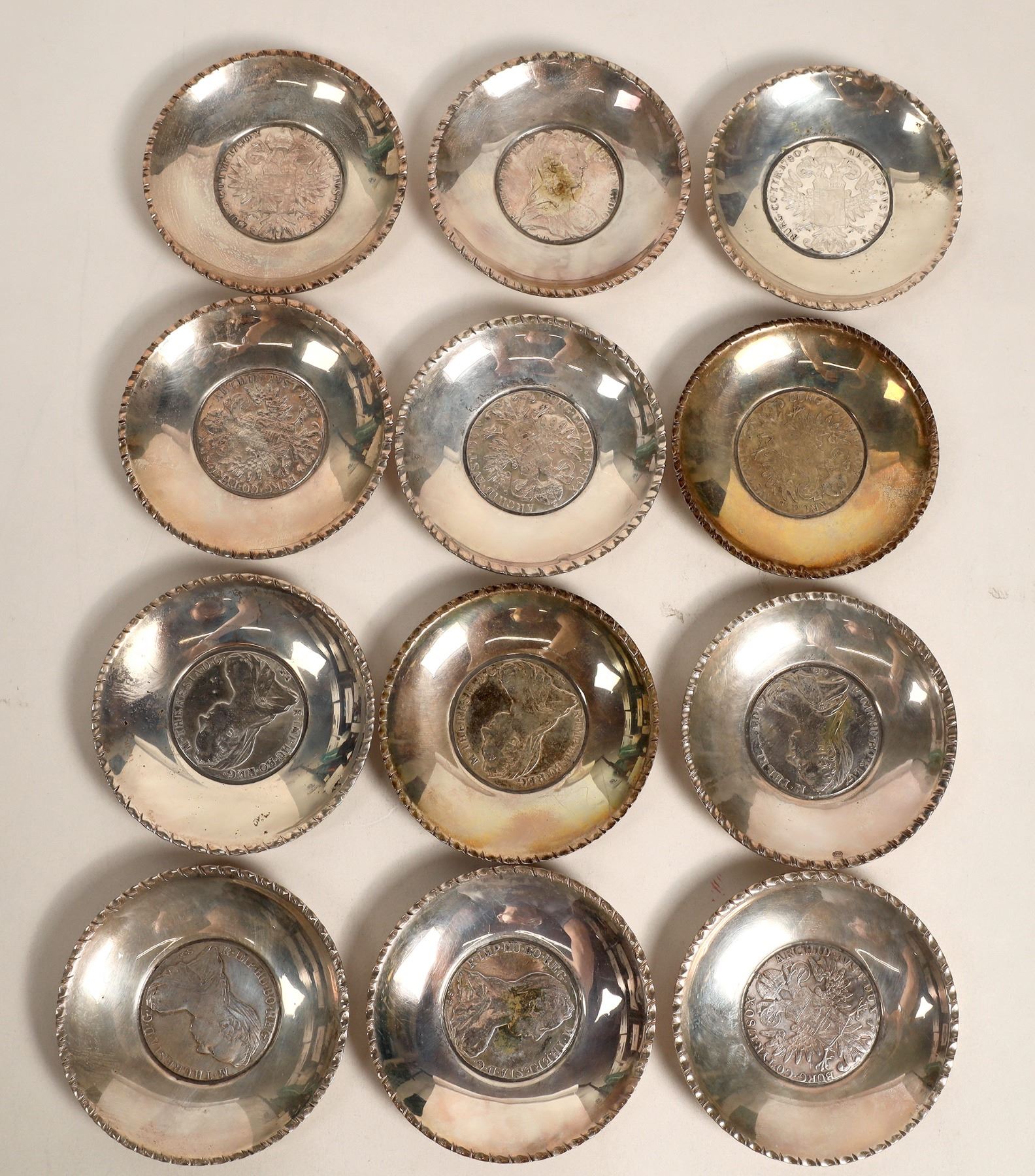 Twelve silver dishes, 3 1/4 inches wide, 1/2 inch deep with Maria Theresa silver thalers at their center. A total of 636 grams of .800 silver.