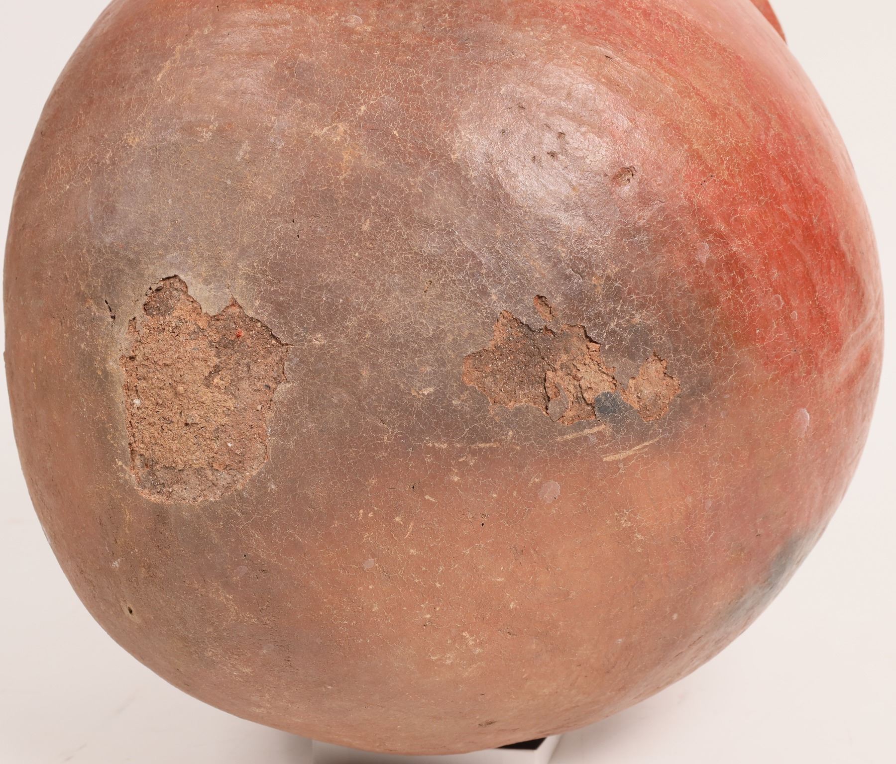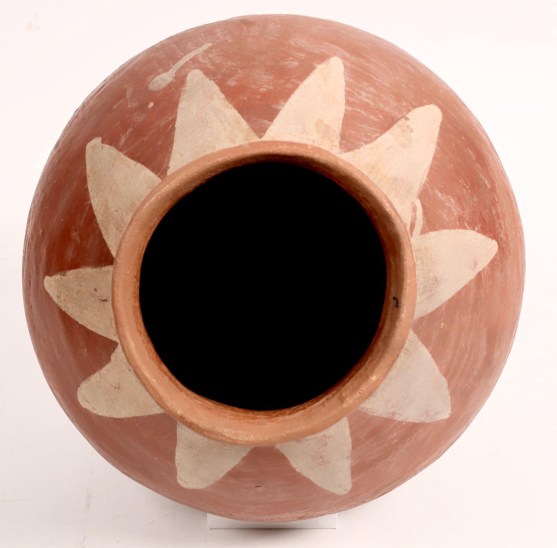 Vintage Maricopa red ware jar with white triangular design around neck. 12.5x15", base has several chipped, worn areas.