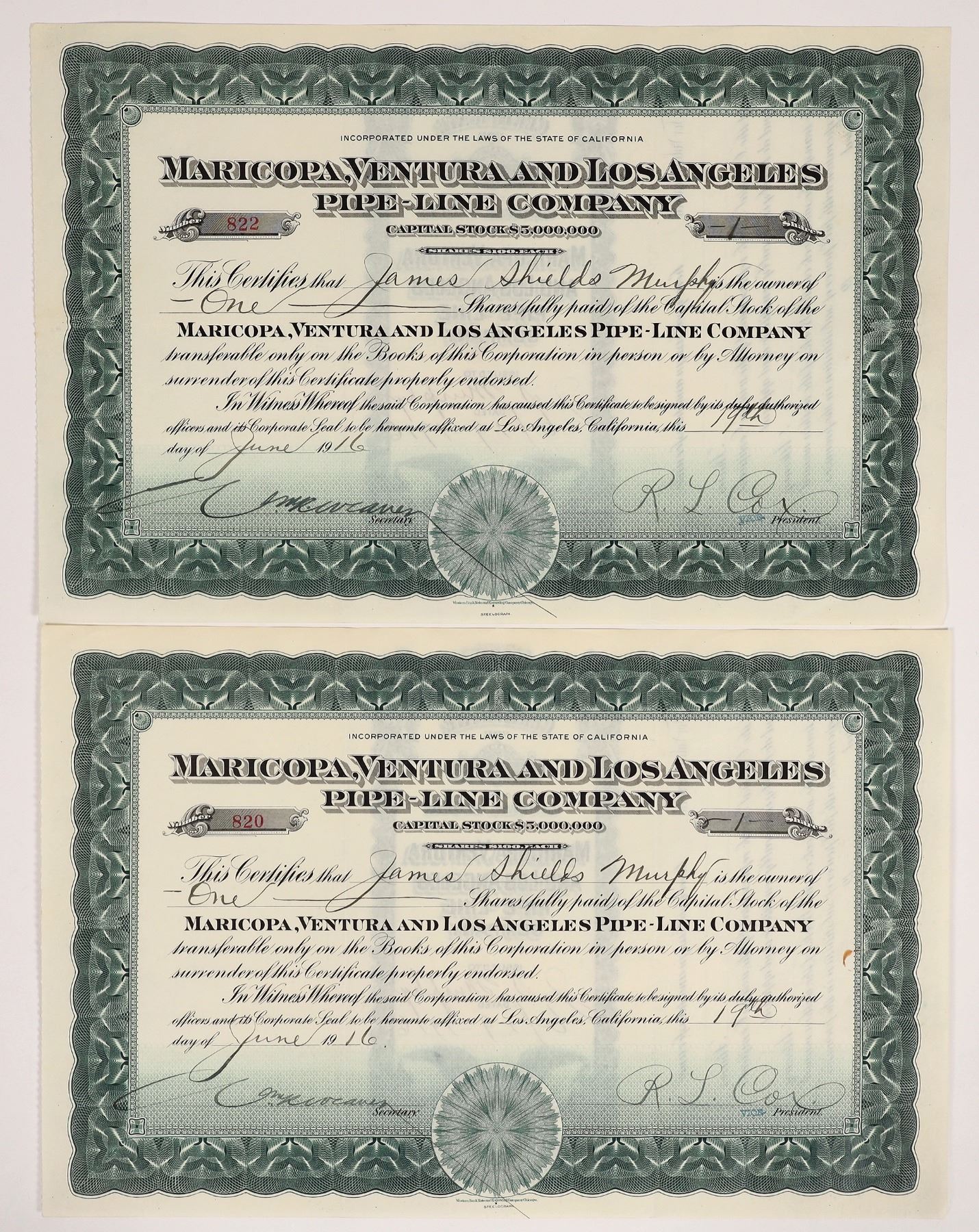 Lot of 2 stocks issued in 1916. Not cancelled. Each issued to James Shields Murphy. Signed by vice president RL Cox and the secretary. Green border, black print. Folds. The Maricopa, Ventura and Los Angeles Pipe-Line Company was incorporated in November of 1912 in California. The company's properties were known as the Maricopa-Midway oil fields, located in Kern, Ventura and Los Angeles Counties.