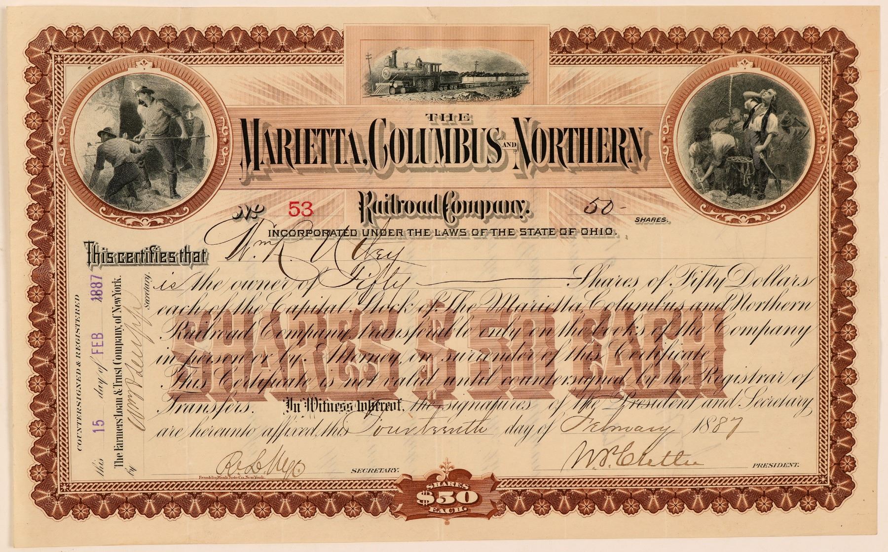 #53, I/U, 50 shares common stock $ $50 par, issued Feb. 14, 1887. BROWN, vignettes: top 4-4-0 coal train r-l, left miners working and right two miners calling for bucket pull up. "SHARES $50 EACH" in brown underprint, Franklin Bank Note Co. EF Ken Prag Collection
