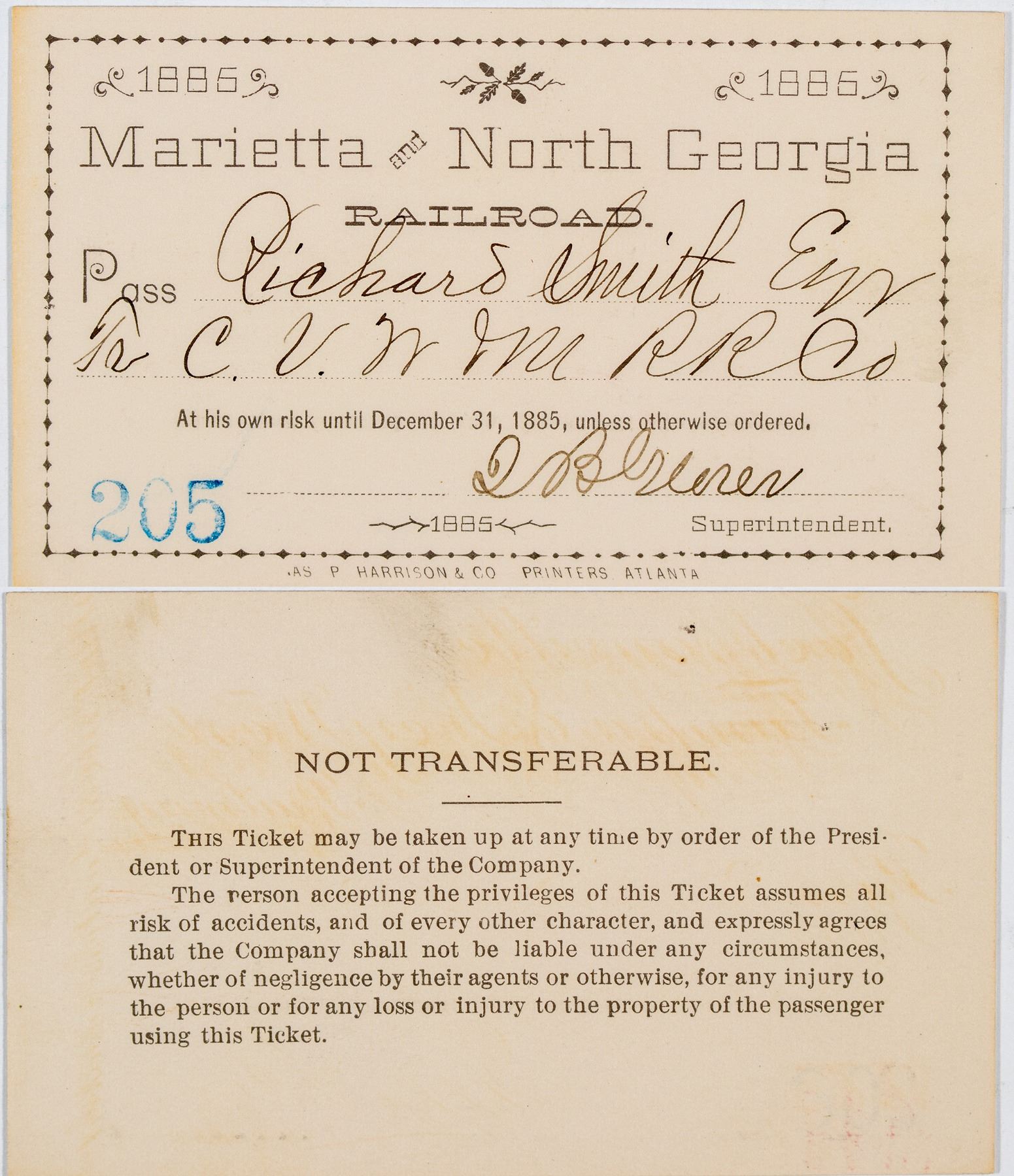 Rare. Pass no. 205, issued in 1885 to Richard Smith. Signed by superintendent JB Glover. Printed by Jas. Harrison & Co., Atlanta. The original plan for this railroad was to haul from marble quarries in northern Georgia and from iron ore mines in North Carolina. It was constructed as a 3' narrow gauge line, but a third rail was added in the late 1880s to accommodate both standard and narrow gauge trains. The line was reorganized as the Atlanta, Knoxville & Northern Railroad in 1896.