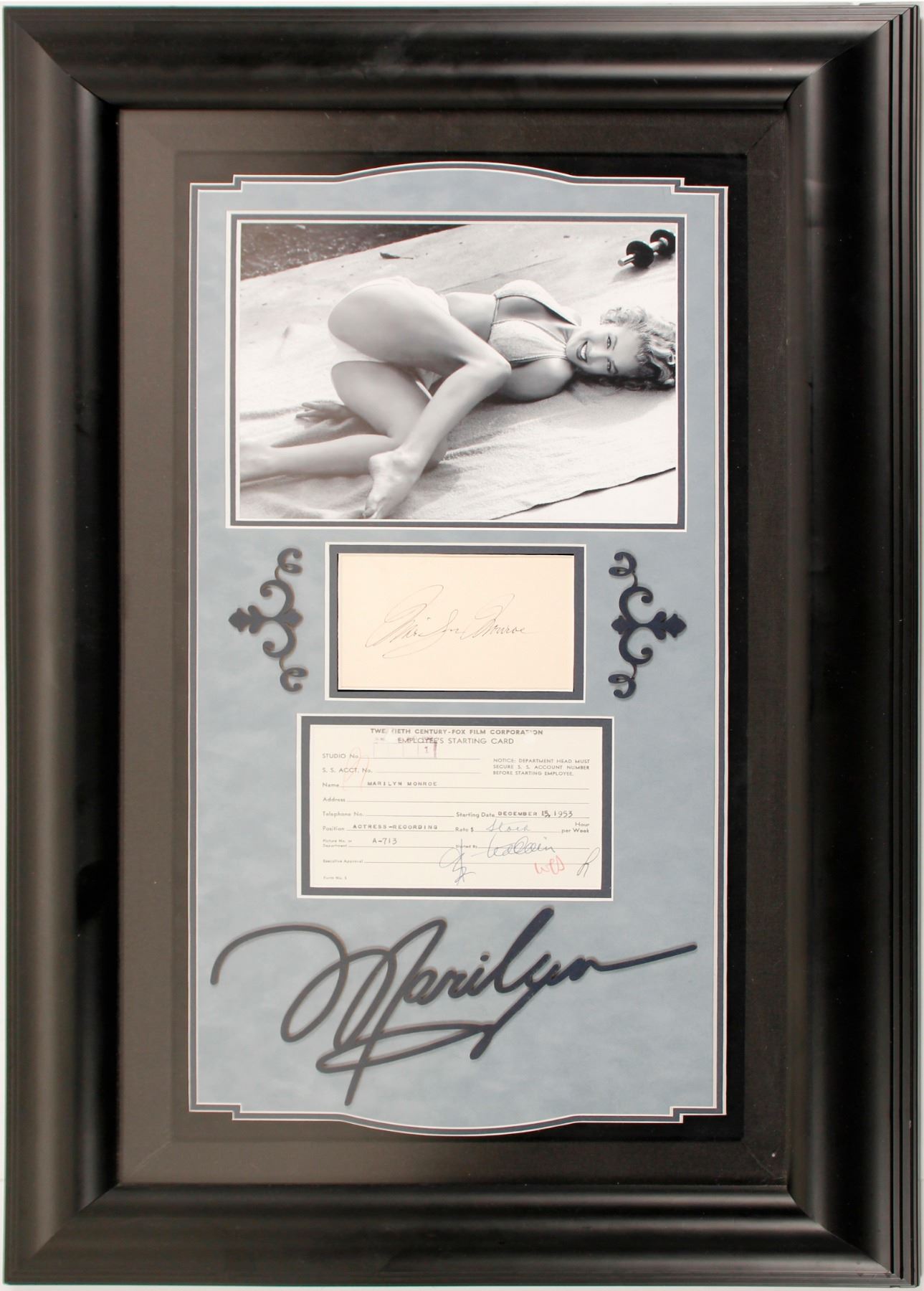 Rare find, Certificate of Authenticity of Ink Signature Document & Payroll Card from 20th Century Fox. This lot is a beautiful black & white photo matted with Marilyn's original signature and the Employees Starting Card. Photo is 9" x 7.25", with frame is 30.5". Black velvet backing in black frame. Marilyn's large signature is clear, 3.5" x 1.5". State: City: Date: 1953 HWAC# 76961