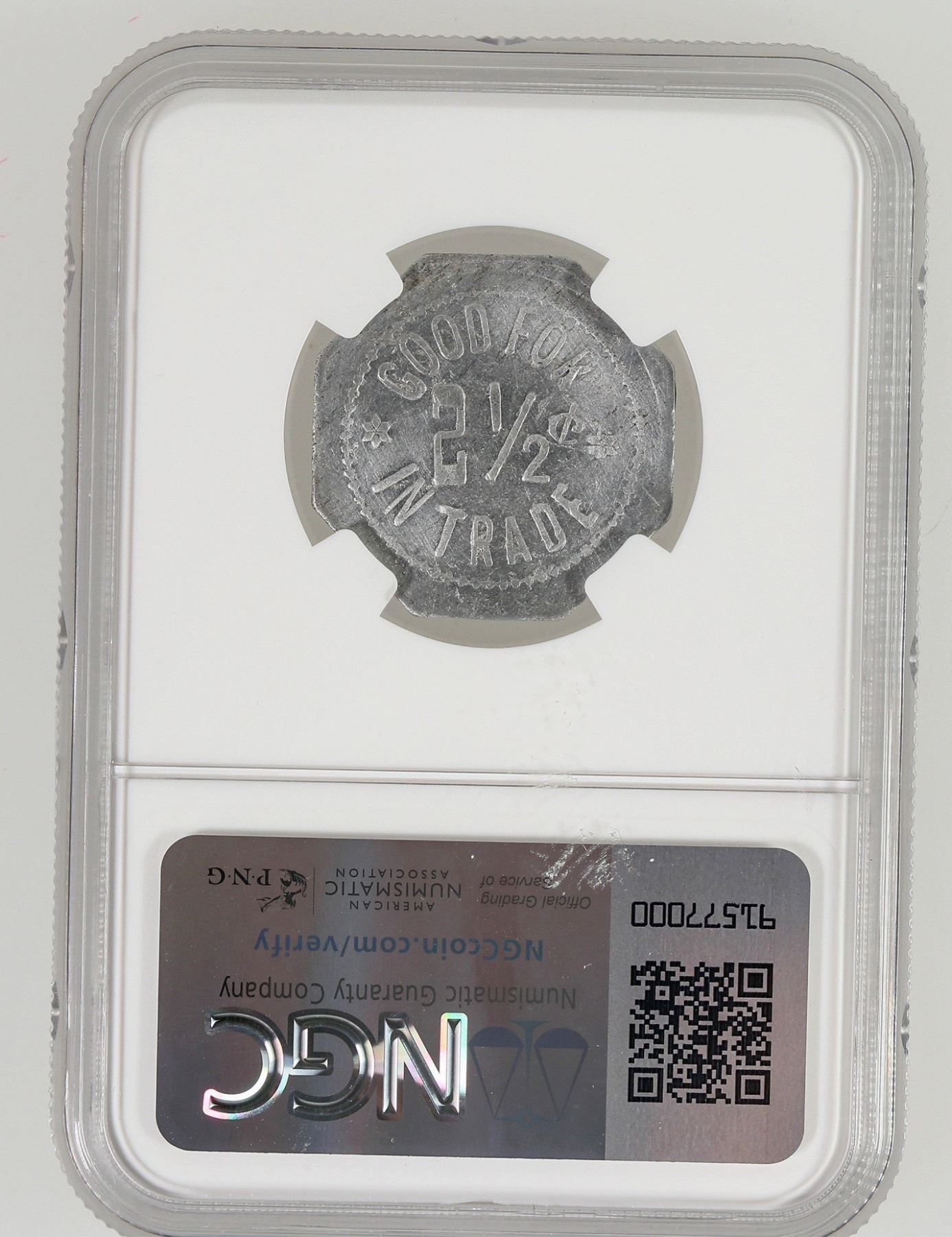 NGC certified XF Details, harshly cleaned. Marine Barracks / Post Exchange / Mare / Island // Good For / 2 1/2c / In Trade; Al, octagonal, 25 mm.