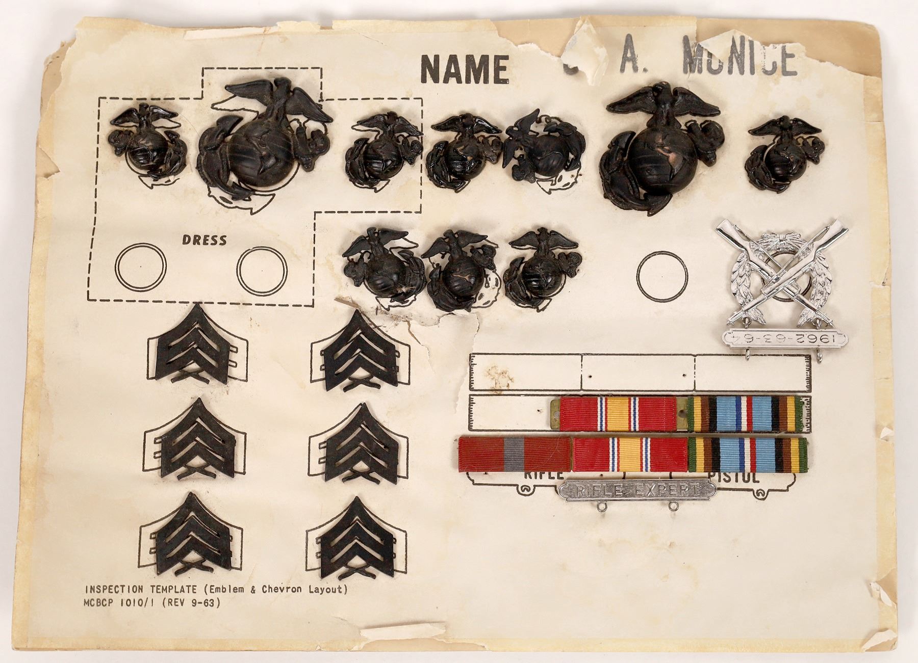 Lot of 18. Hat/Collar insignia (10), 6 sergeant collar devices, Rifle expert badge w/years 1962-64. Two ribbon mounts: National Defense ribbons, good conduct, Armed Forces Expeditionary ribbon. Good condition, all mounted on Cardboard display w/name G.A. Minice.
