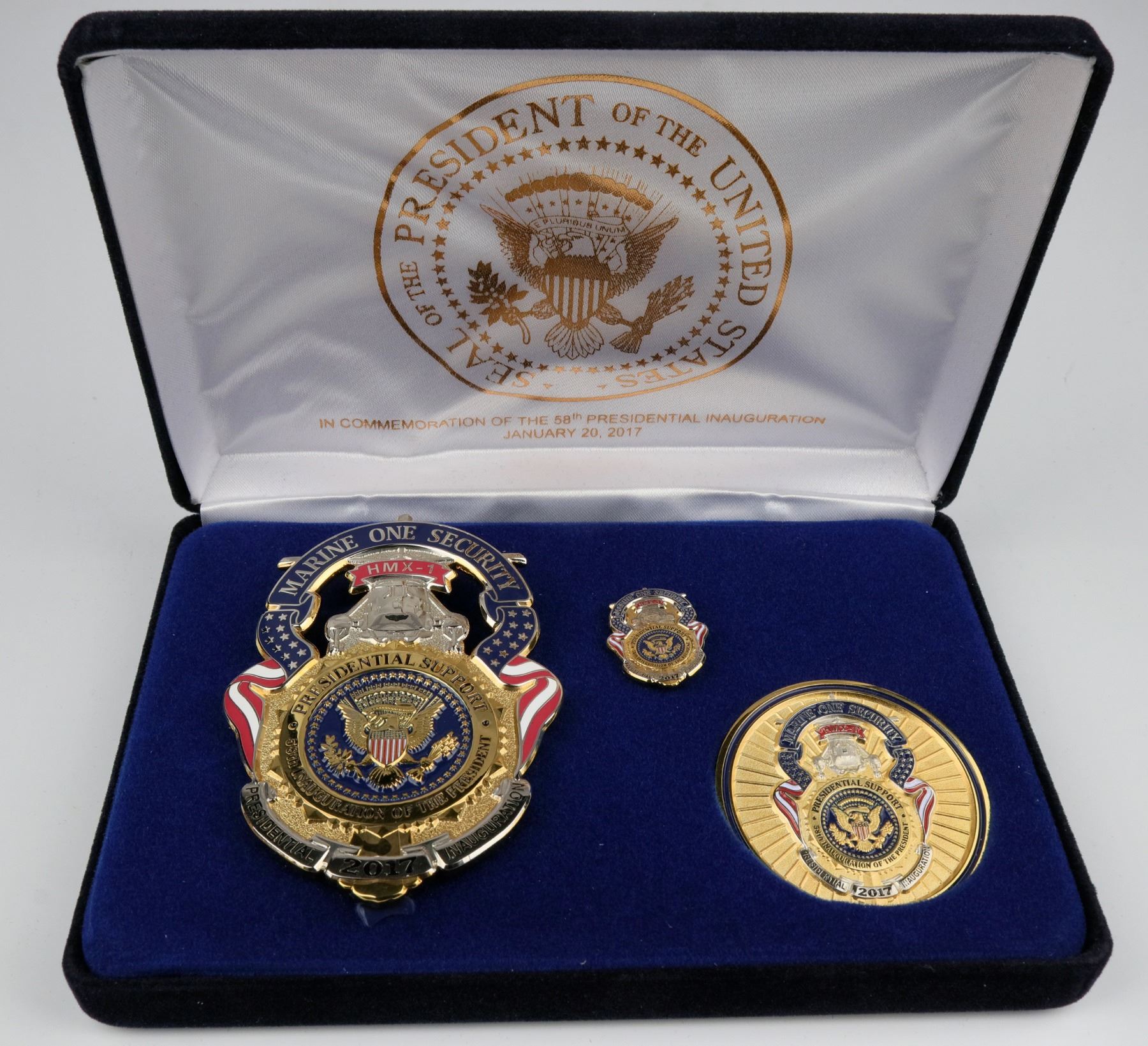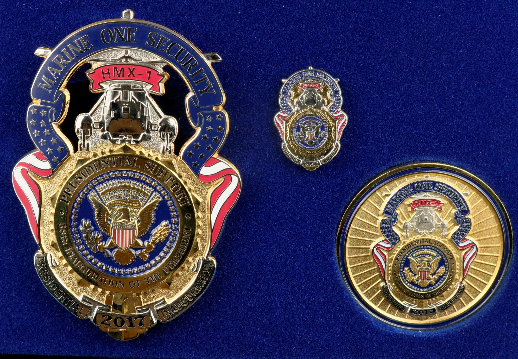 Made by Collinson, solid brass, 24k pure gold and rhodium plate. This is a complete presentation box w/Badge, lapel pin (mini badge) and Challenge coin, satin liner, gold foil on satin and outside of box. Initial issue available only to Law Enforcement and Military personnel. #181, 3 1/2 by 2 1/4” Beautiful designed badge. Top banner Marine One Security w/Helicopter cut out and HMX-1 above. Presidential seal center, Stars and Strips on sides. 2017 bottom banner. Mirror back and Pin and clasp, Lapel pin is exactly as the full size. Challenge coin obv: copy of badge w/burst background. Rev: Marine one taking off from White House, Marine One Security in green around outside Certificate by Collinson included. Difficult to find., rare. Item is sold as a historical/collectible only. It does not convey, nor should it be used as an authority of any kind. Sale of this item is in full compliance with the United States Federal Law : 18 USC ss716. Impersonation of a police officer is a felony in most jurisdictions and subject to arrest.