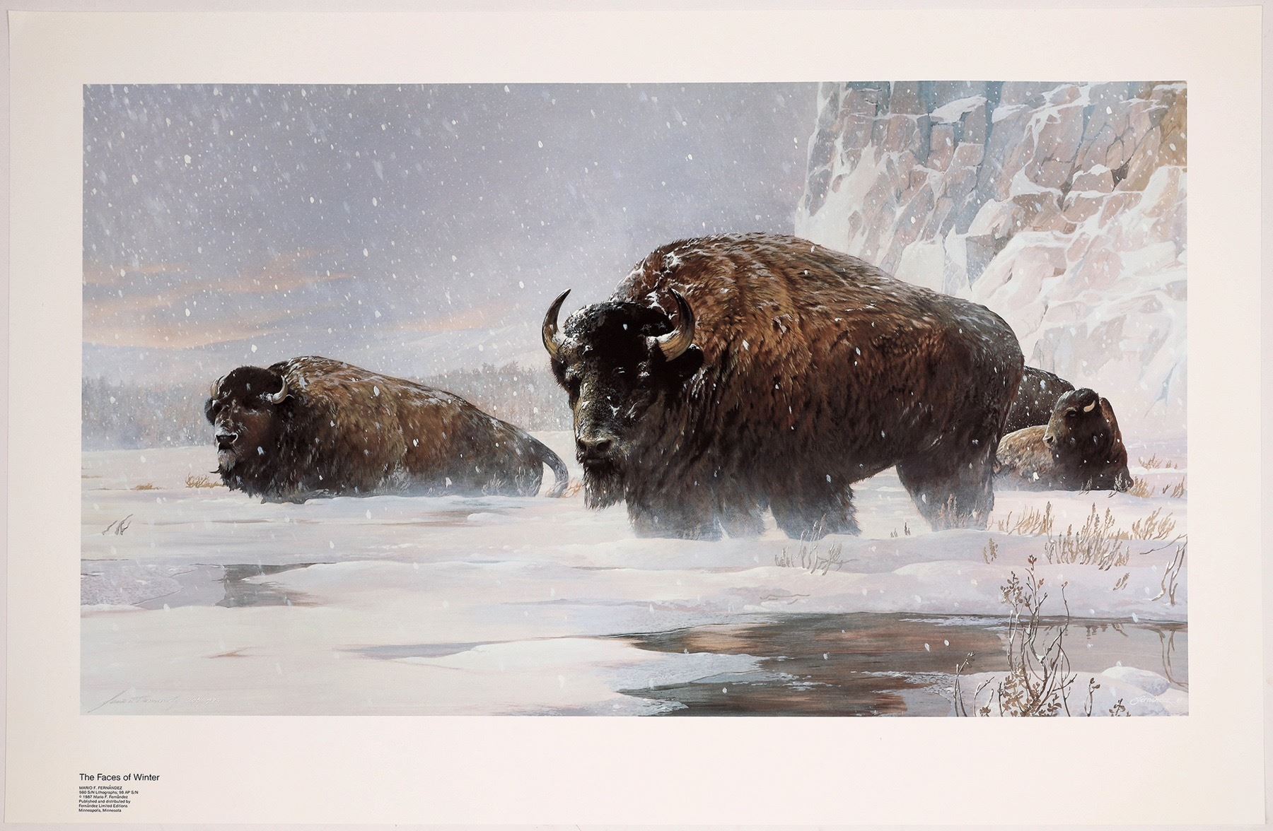 Faces of Winter, a fine-art lithograph by artist Mario F Fernandez, released in 1987 as an issue of 980 prints. Depicts bison on a snowy scene. Page is 34 x 22-1/2 inches, and the image is 30 x 17-1/2 inches. Pristine condition. Born in Havana, Cuba, in 1946, and by age sixteen he was imprisoned by Castro for political dissent. He was eventually freed and arrived in the United States in 1965 where he began to develop his art career.