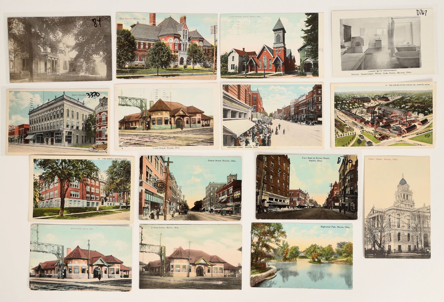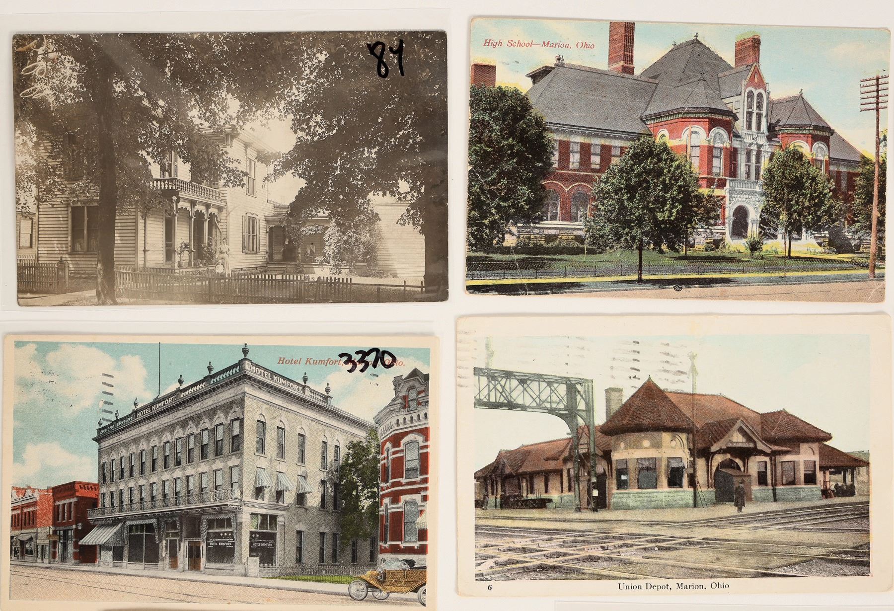 15 Marion postcards. 1 RPC-2 story house. Also, high school, Petticoat lane, Hotel Kumfort, Union Station, Center Street etc.[ Marion County Ohio