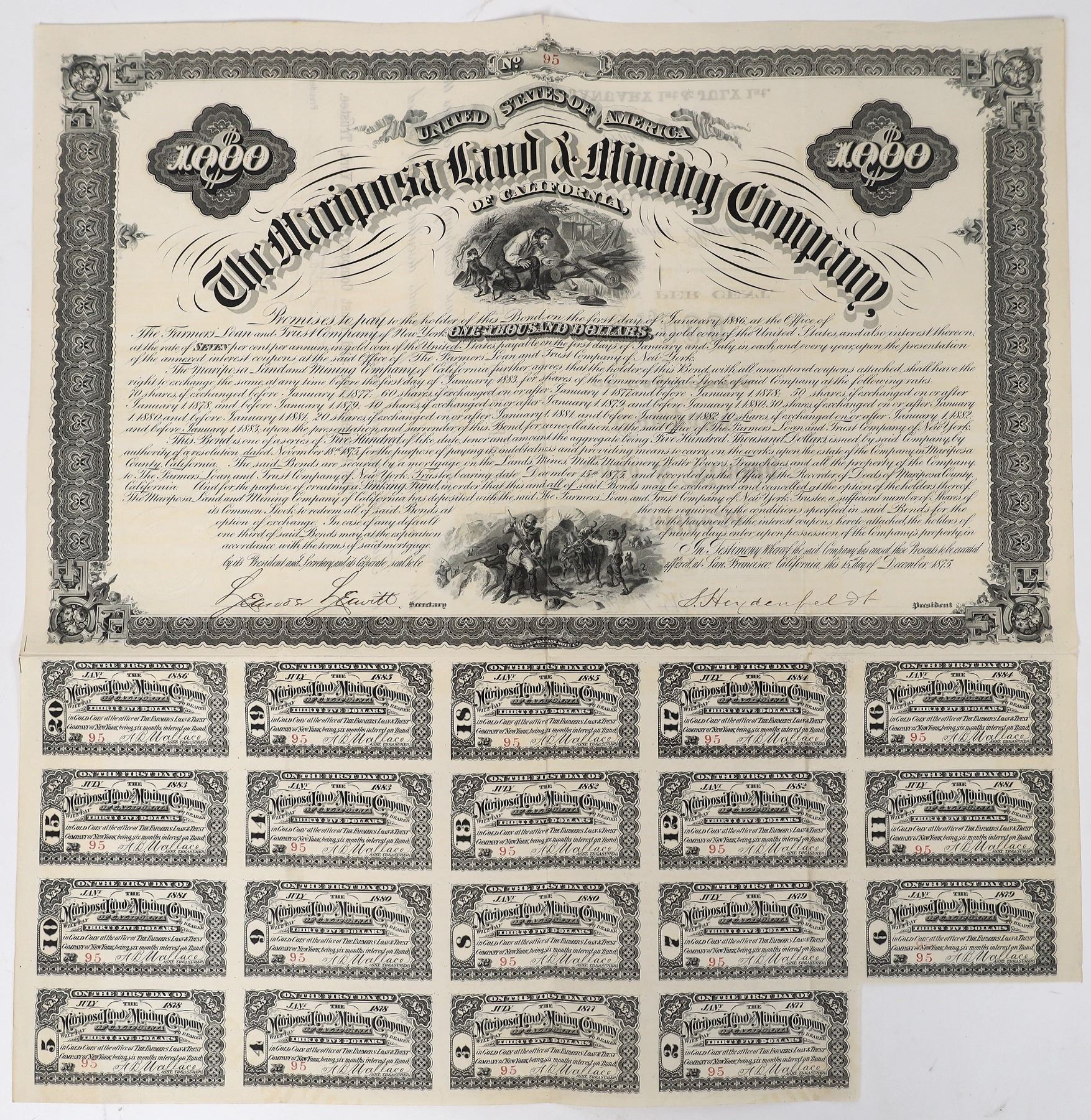 Extremely rare. $1,000 bond certificate issued in 1875 at San Francisco. No. 95. Signed by S. Heydenfeldt as president and L. Leavitt as secretary. Not cancelled. Top vignette depicts John Marshall at the discovery site at Coloma, Sutter's Mill in January of 1848: note the lumber mill, the tail race, and he is just about to discover the first nugget! Bottom vignette shows cowboys and Native Americans at the bottom. Nineteen coupons attached at the bottom. Some toning, folds, creases, minor separation. Printed by Continental Bank Note Co. Approx. 17 x 15.5" Solomon Heydenfeldt (c. 1816 - September 15, 1890) was an American attorney who was an Associate Justice of the California Supreme Court from 1852 to 1857. He was the second Jewish justice of the court. This mining company was one of the companies formed to operate the Mariposa Estate, originally the Mariposa Land Grant, owned by John C. Fremont. The Josephine, Pine Tree, Princeton and numerous other mines comprised the estate. The Mariposa Land & Mining Co. was organized in 1871 to relieve debts and the company was again reorganized in the 1880s under the name Mariposa Mining and Commercial Company. Mariposa California 1875