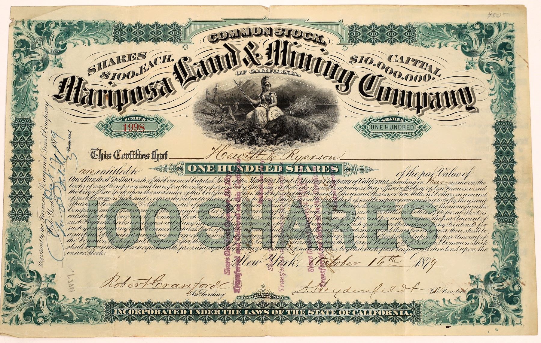 Incorporated under the laws of the State of California. Issued to Hewitt Ryerson on October 16, 1879. Signed by S. Heydenfeldt as Vice President and Robert Cranford as Assistant Secretary. Uncancelled. Approximately 9 x 12". Vignette of allegorical woman and bear (Seal of State of California), and farmers at center top. Five assessments on reverse. Printed by National Bank Note Co., New York. Certificate No. 1998 for 100 shares. Green print. Creases and pinholes, otherwise very fine. This is one of the several companies that were formed to operate John C. Fremont's Mariposa Estate. King is probably no other than Charles Henry King, owner of the 13,000 acre San Lorenzo Ranch. Mariposa California Franklin Collection