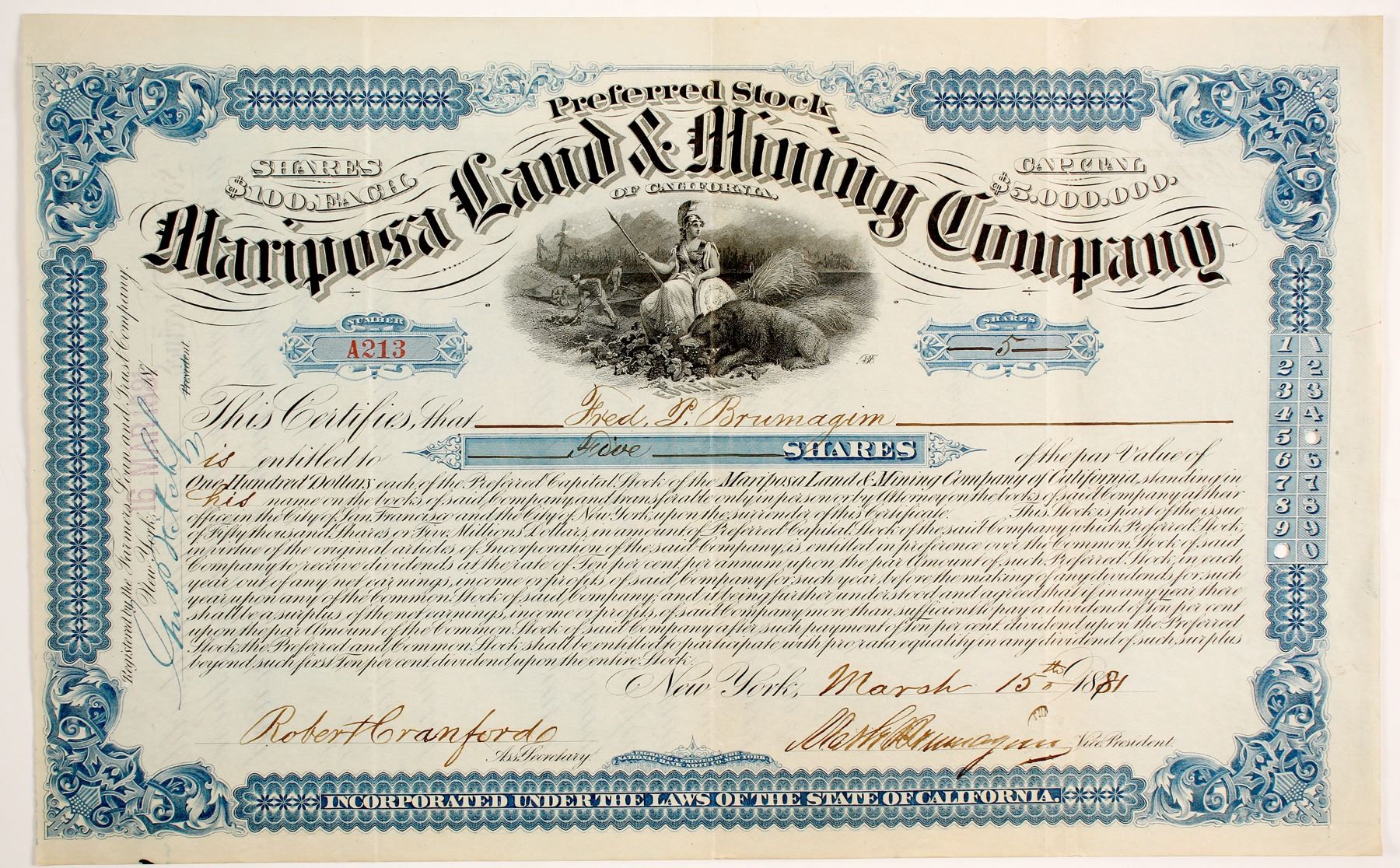 Common stock certificate # A213 for 5 shares dated March 15, 1881 made out to Fred Brumagin. Signed by Mark Brumagim, Vice President, and by Robert Cranford, Asst. Secretary. Incorporated on June 25, 1863 and capitalized at $10,000,000; 100,000 shares at $100 each. Vignette at top center of allegorical woman, seated next to a bear, and men farming in the background. “Eureka” is printed at the woman’s feet. Orange border, black print. Uncancelled. Printer: National Bank Note Co. Datelined New York. 8 x 12.5.” The company had also issued preferred stock at $5,000,000; 50,000 shares at $100 each issued as a similarly designed certificate except printed with a blue border. Solomon Heydenfeldt, a well-known San Franciscan attorney and former California State Supreme Court Justice, was President of the company. This company was one of several established from part of the original Rancho Las Mariposas estate, a Spanish land grant owned by John C. Fremont, which he had purchased from Juan Alvarado in the 1840s. In the 1880s it was reorganized as the Mariposa Mining & Commercial Company. Prag Collection