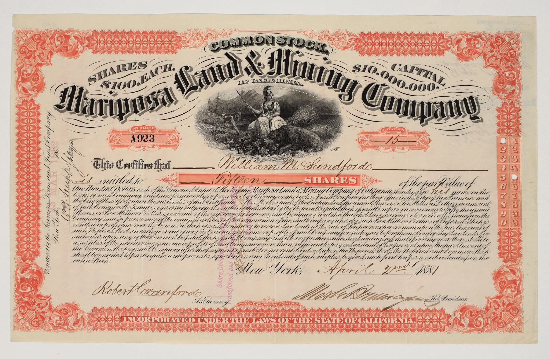 No. A923, issued for 15 shares to William M. Sandford in New York in 1881. Signed by the vice president and secretary. Not cancelled. Red border, allegorical woman with bear vignette. National Bank Note Co. 7.75 x 12.25" The Mariposa Land & Mining Co was organized in 1871 and incorporated in the state of New York. This is one of the several companies that were formed to operate John C. Fremont's Mariposa Estate.