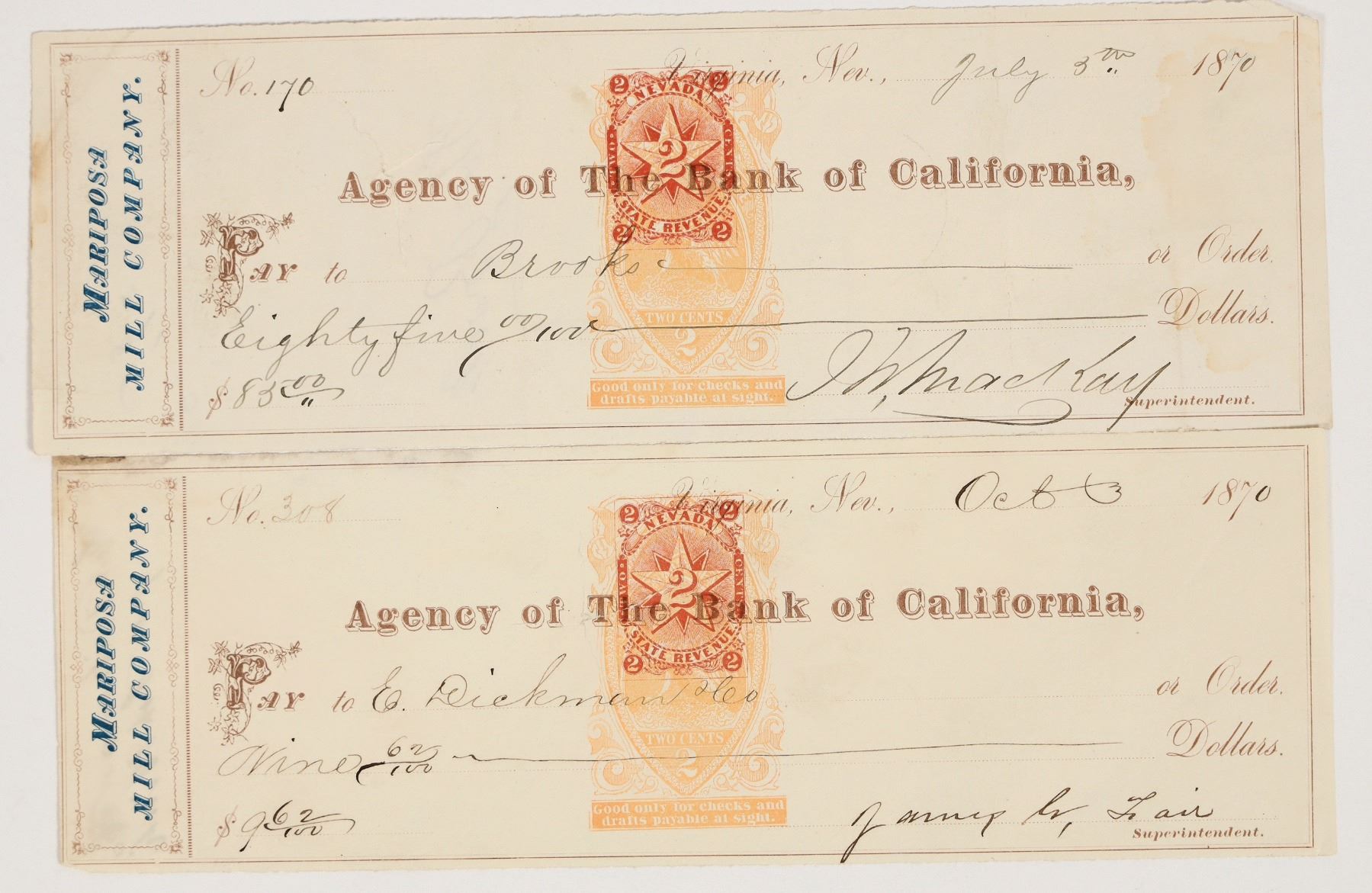 Lot of 2. Very rare imprinted revenue! 1) Check issued in 1870 to E. Dickman & Co. Signed by "Bonanza King" mining millionaire/US senator James G. Fair. RN-B16a. 2) Check issued in 1870, signed by "Bonanza King" mining millionaire John Mackay. The Mariposa Mill was located at the head of Sevenmile Canyon, south of the Sierra Nevada Mine, and north of Virginia City. Kelley reports on it in 1862. By 1867, the Bank of California/William Sharon ring owned it and it was called the California Mill. In 1871-72, it was again known as the Mariposa Mill and was processing ore from the Hale & Norcross. [Ref: Ansari]