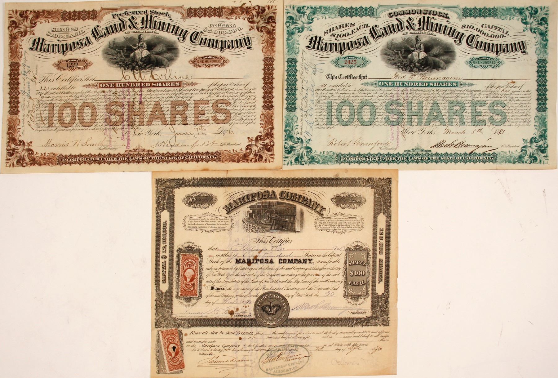 "Mariposa is where explorers John C. Fremont and Kit Carson found the rich Mariposa Vein and opened the first mill to crush ore and extract gold in California" from www.parks.ca.gov 1)Mariposa Land & Mining #1222 i/u to CA Collins, 100 shares, signed by vp Mark Brumagin, incorporated in CA 2)Mariposa Land & Mining #2425 i/u to CA Collins 1876, signed by vp Haydenfeldt 3) Mariposa Company-likely John Freemont's company,"The largest mine owned by the Mariposa Company -- the Princeton -- which is referred to as having become unprofitable under the present manager, has not only been profitable, but more profitable under his management than it was immediately before. In no month has it paid as poorly as it did in the month before he took it in hand. The whole amount of, quartz at present taken from the mine is richer, on an average, than the average yield during two years before it came into the possession of the Mariposa Company." from NY Times 1864, #4781 i/u to Fellowes and Co 1870, 100 shares, note toning spots.