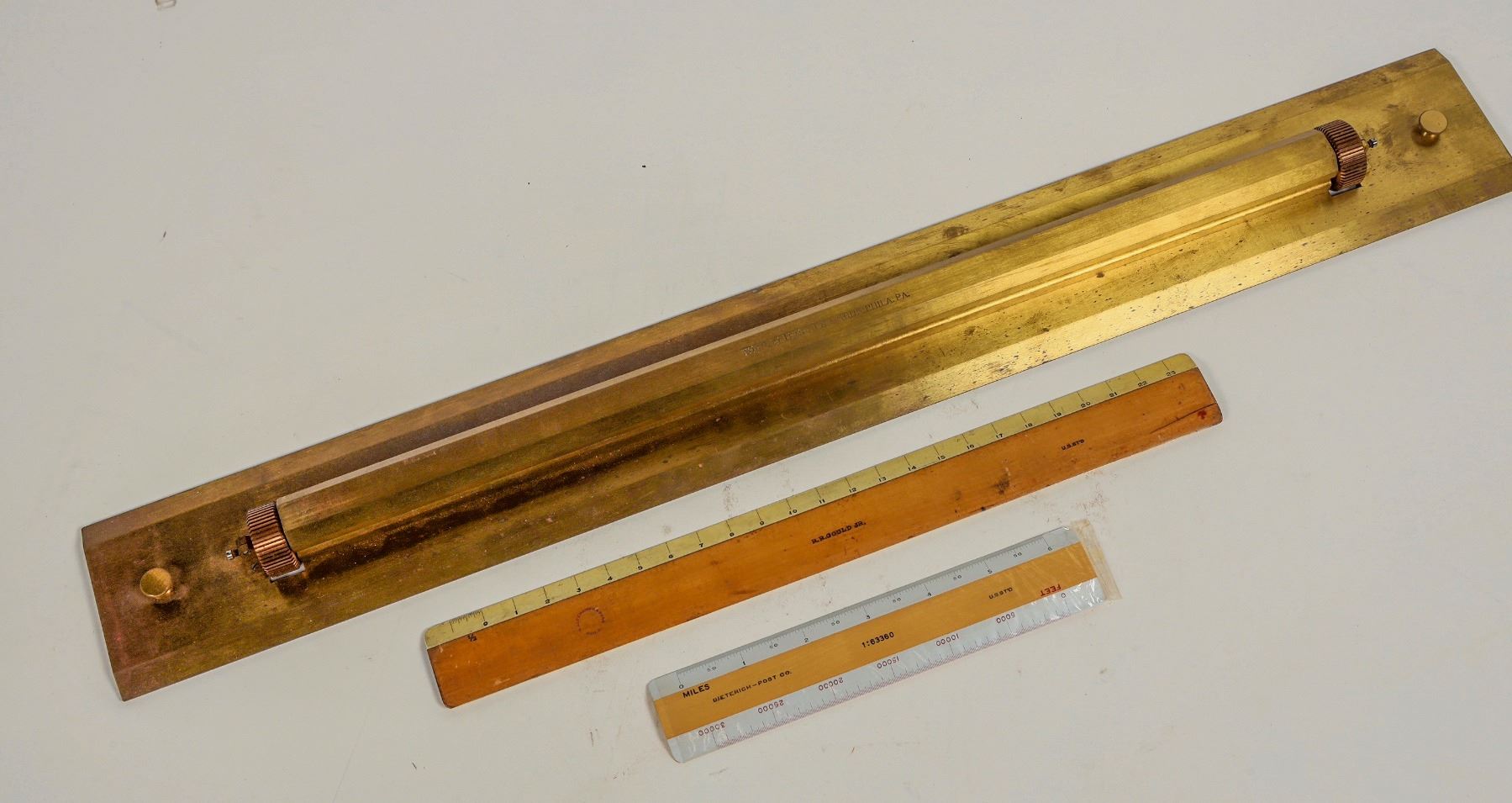 This maritime parallel rolling ruler is 3 in. X 24 in. overall length made by "Theo. Alteneder & Sons Phila. Pa. ". It was not assigned or marked to a vessel and likely owned by the ship's cartographer or navigator. The original carry case is made of red cedar. In excellent condition with all original parts. No model number shown. The rolling rule is also accompanied by an Alteneder 1:63360 scale at 6 in. plus a R.R. Gould 12 in. map reading scale. Please see photos for details.