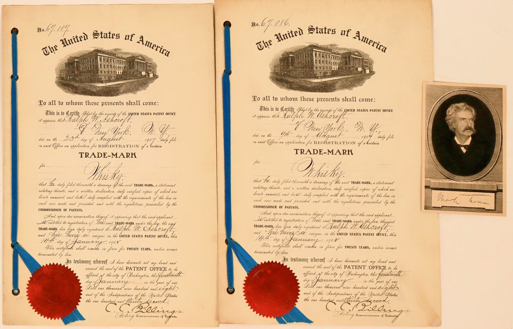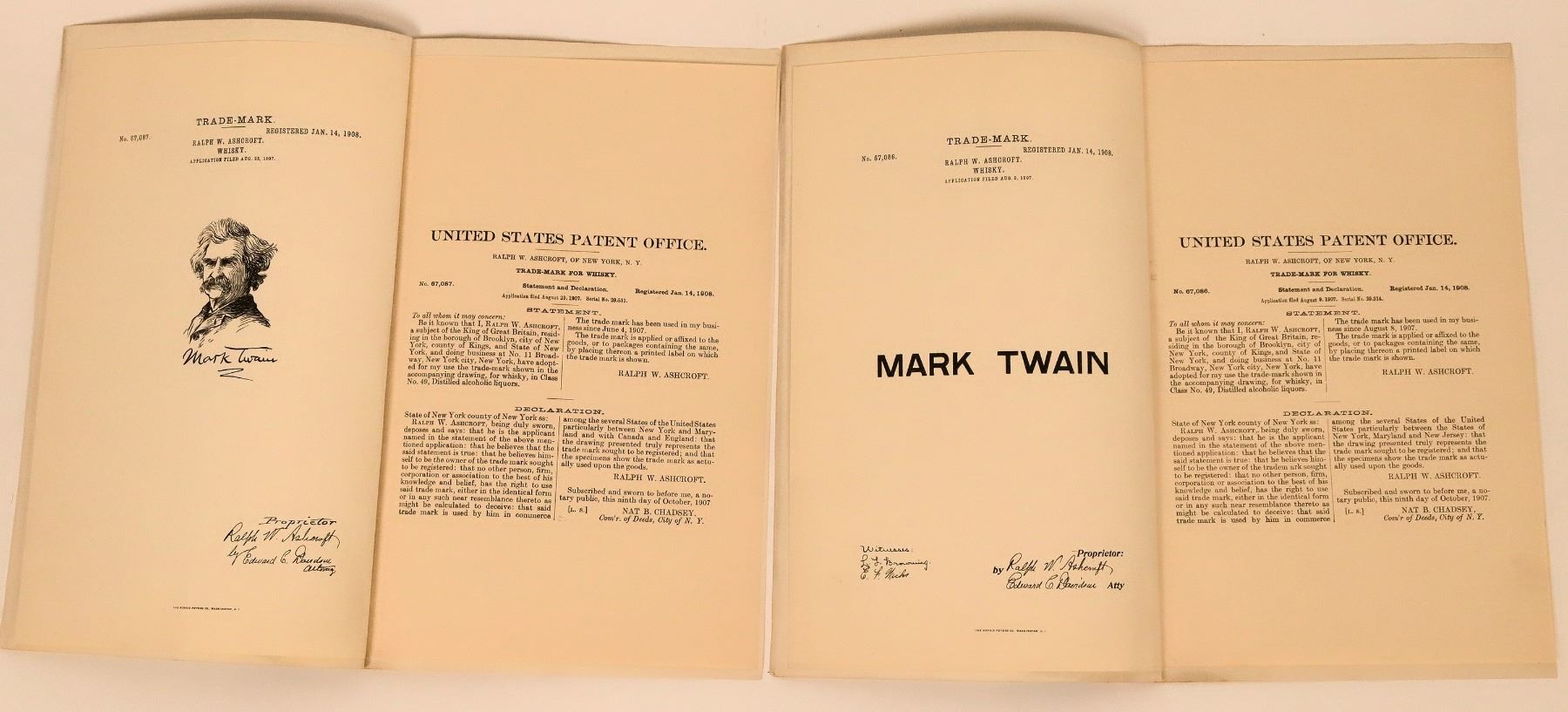 Lot of two US patents filed by Ralph W. Ashcroft, business manager of Samuel Clemens (Mark Twain) in 1908. Patents 67.086 and 67.087 trademarking the name "Mark Twain" as well as Twain's likeness and autograph for use on whisky products. 8 x 12" According to notes in the Autobiography of Mark Twain, Volume III, Ashcroft was worried about Clemens likeness and name being used for profit and convinced him to take steps to protect them. In Nov. 1907, Ashcroft filed these two patents (as well as two for tobacco) to protect his name, likeness, and signature from being used on liquor or cigar products. To satisfy and keep the patents valid, Ashcroft said "one bottle of whiskey and a few cigars would be turned out."(New York Tribune, Jan. 6, 1908). Ashcroft also convinced Clemens to further protect his intellectual property by creating the Mark Twain Company in 1908 and transfer rights to his literary name and works to that corporation. There does appear to be some debate as to why Ashcroft filed the patents in his own name. According to the Mark Twain Project, Clemens fired Ashcroft and his wife (Clemens' former secretary) in 1909 for mismanagement of his affairs. These original historic documents belong with an advanced Twain collector or in an institutional collection! Comes with photo print of Twain.