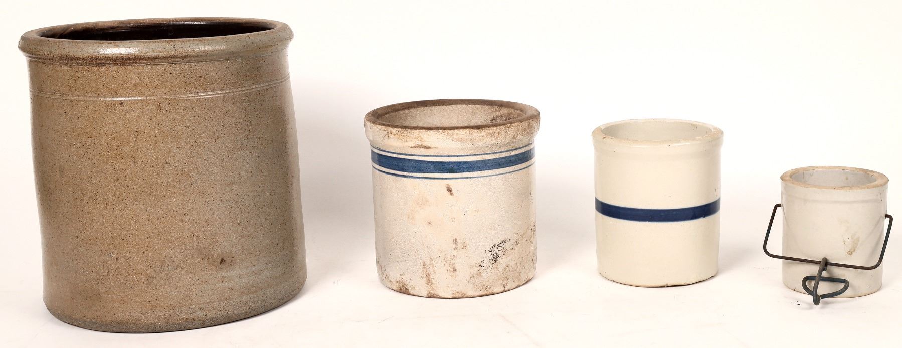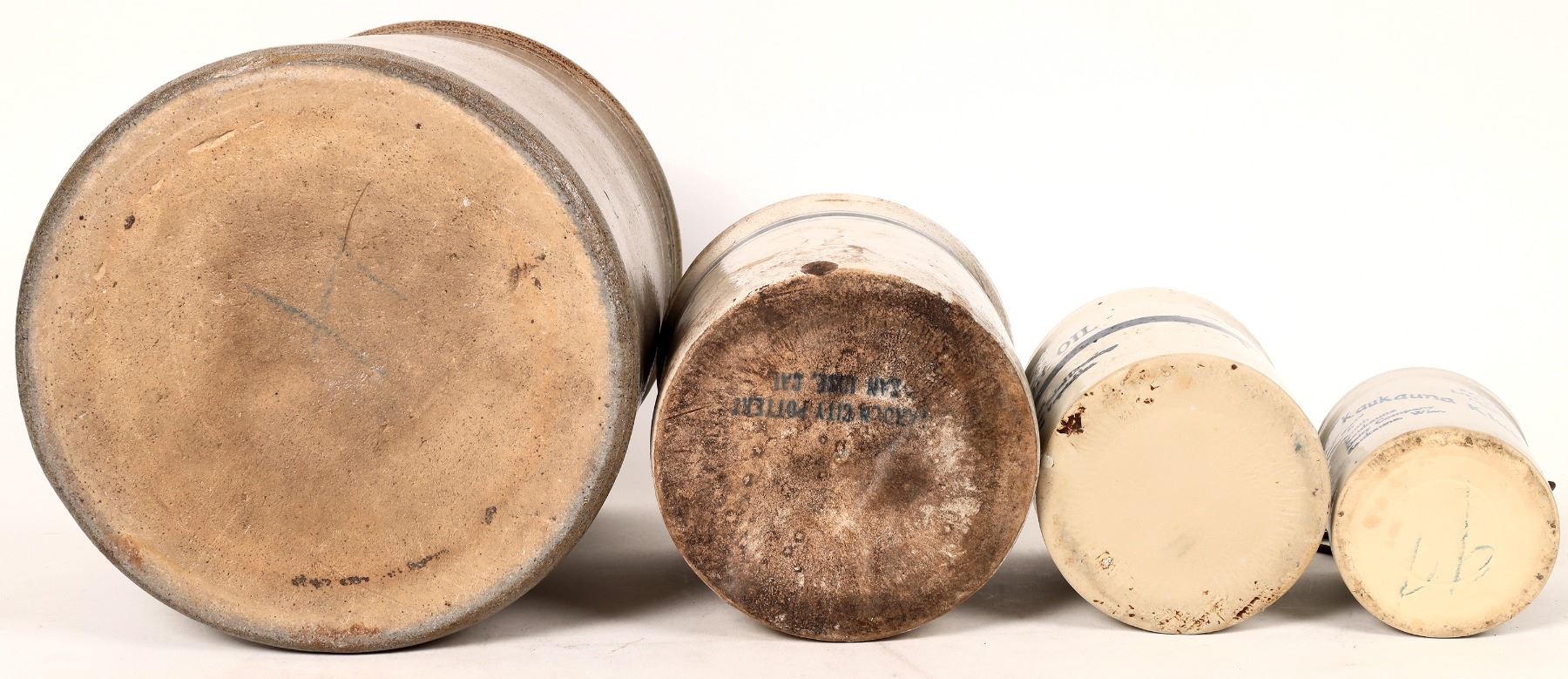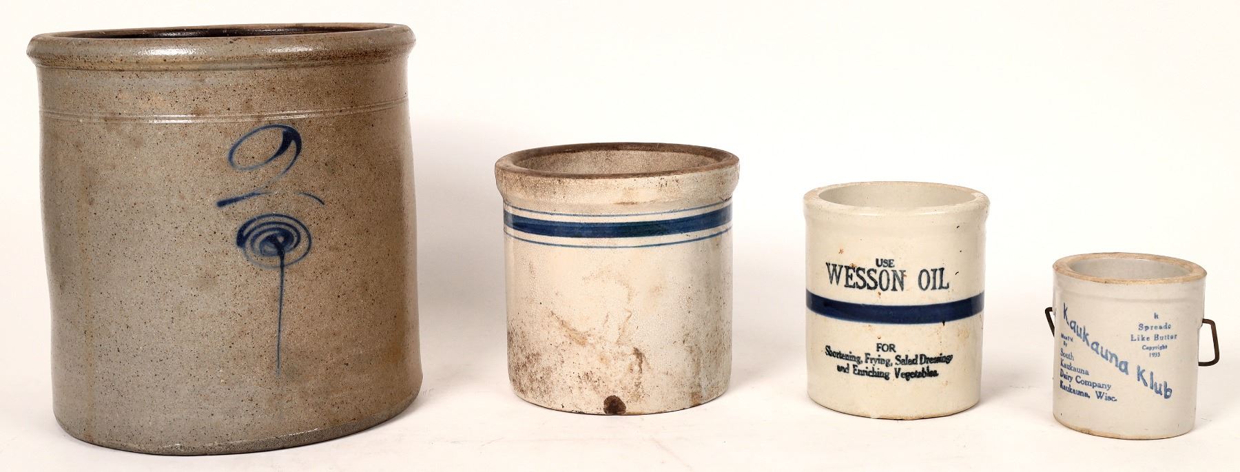 Quartet of marked stoneware. Kaukauna Klub/Kaukauna, Wisc. 3.75x3.5", no lid. Garden City Pottery/San Jose, Cal. 6x6.25", lower .5" chip. Blue swirl, 2 gallon, 9.5x9" . Wesson Oil 5x4.5".