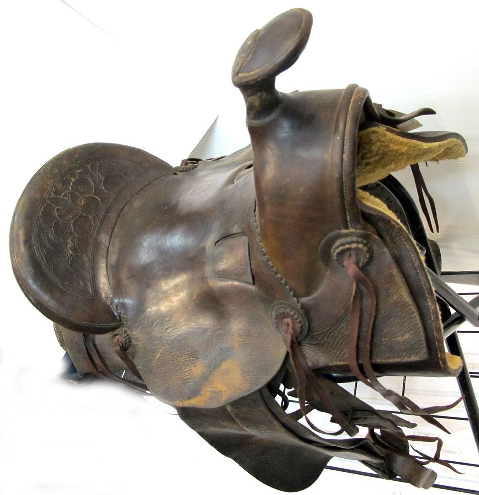 Early style high back saddle with cast iron stirrups. Single center for ring. 1880's. Floral pattern on high back. Saddle maker marks on both left and right leather pads of the rear skirt. The marks are difficult to interpret because one punch pattern was placed directly over the other pattern. On this specific saddle, the initial maskers mark is the Marks Bros. Saddlery Co of Omaha, Neb. They were a major competition of the Collins bros, who started in Omaha, later with a shop in Cheyenne. The Omaha saddleries were important, as the terminus of the Union Pacific Railroad, such that other saddlery sales outfits bought Marks saddles and gear for resale. Here, the saddle was bought by EJ Owenhouse in Bozeman, who marked the saddle with his stamp right over the top of the Marks stamp on both skirts. The Owenhouse outfit was handling saddlery from about 1885-1890, according to Lyndes et al, 2017. This is the oldest saddle in the sale. Date: Location: Bozeman, Montana HWAC # 55957