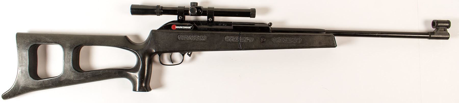 This Marksman expert target pump action pellet gun .17 cal. has a thumb hole pistol grip with a Tasco 4X15 scope with a hooded front sight. Model 1790. All black finish professional target rifle. Set for the professional pellet gun shooter. It has a trigger guard safety, all black in excellent condition.