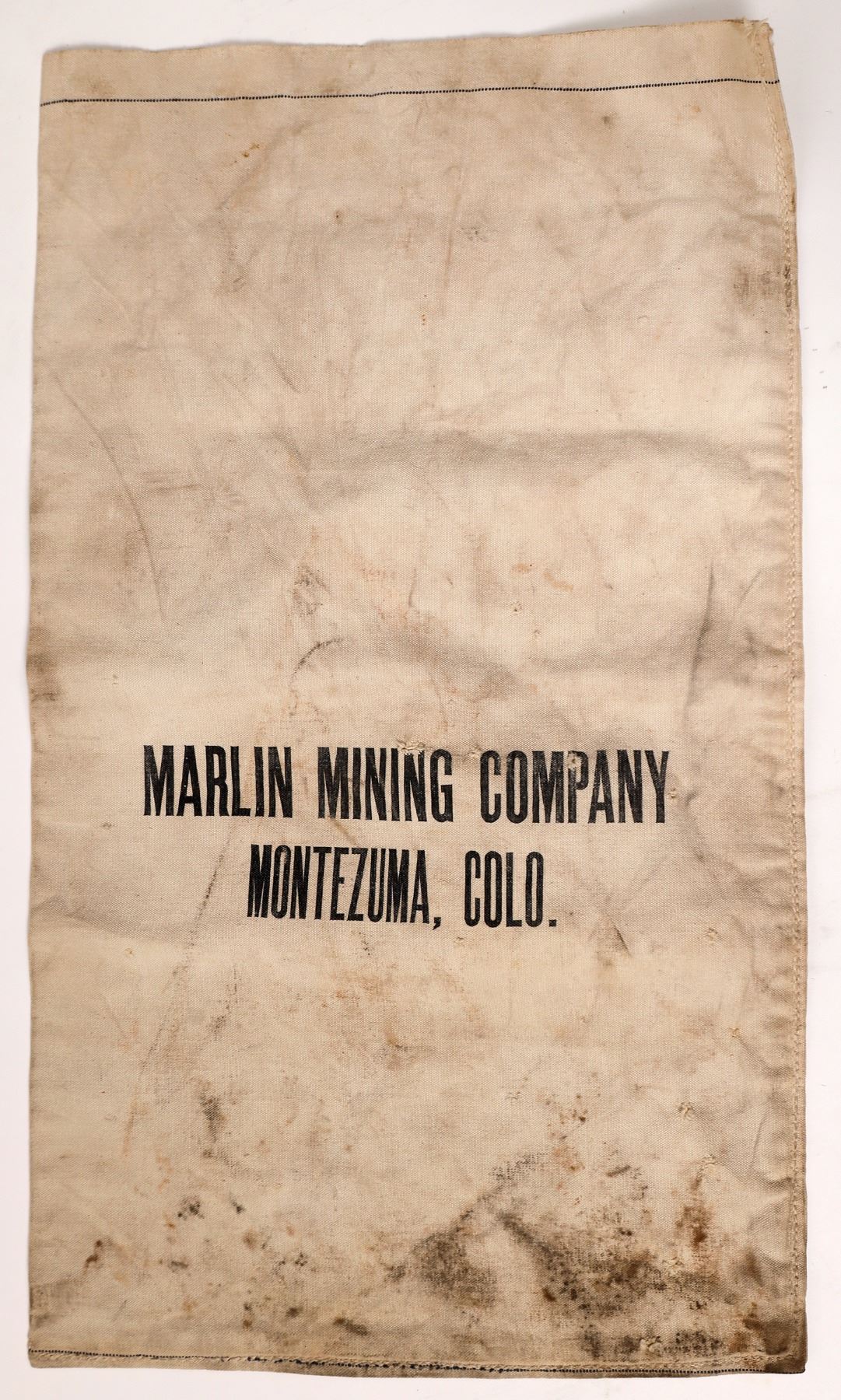 Cloth ore bag from Marlin Mining Company. Elevation of 10636 feet. Marlin Mine is situated nearby to Minnehaha Reservoir, and close to Minnehaha Dam. 24x14.5". Staining.
