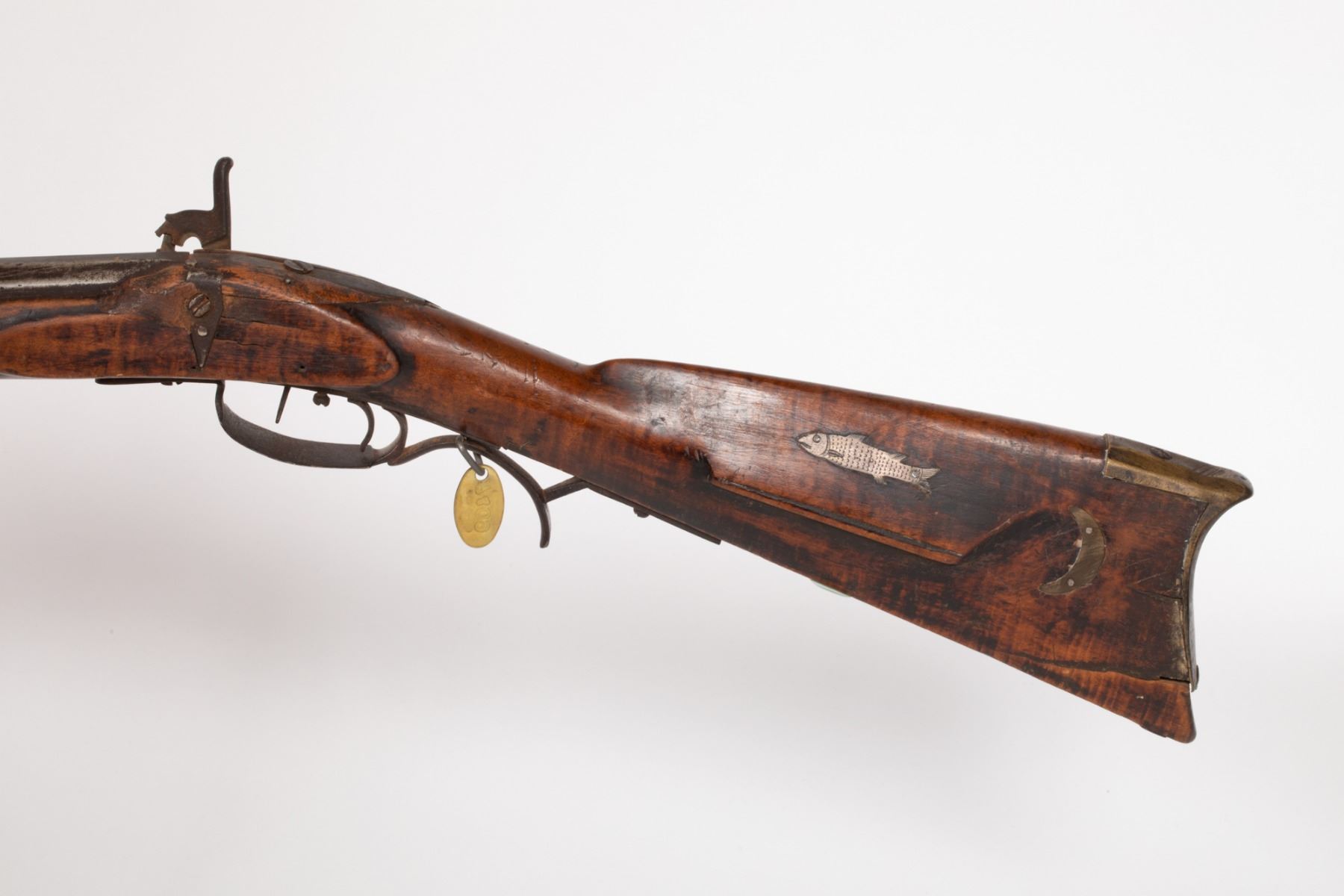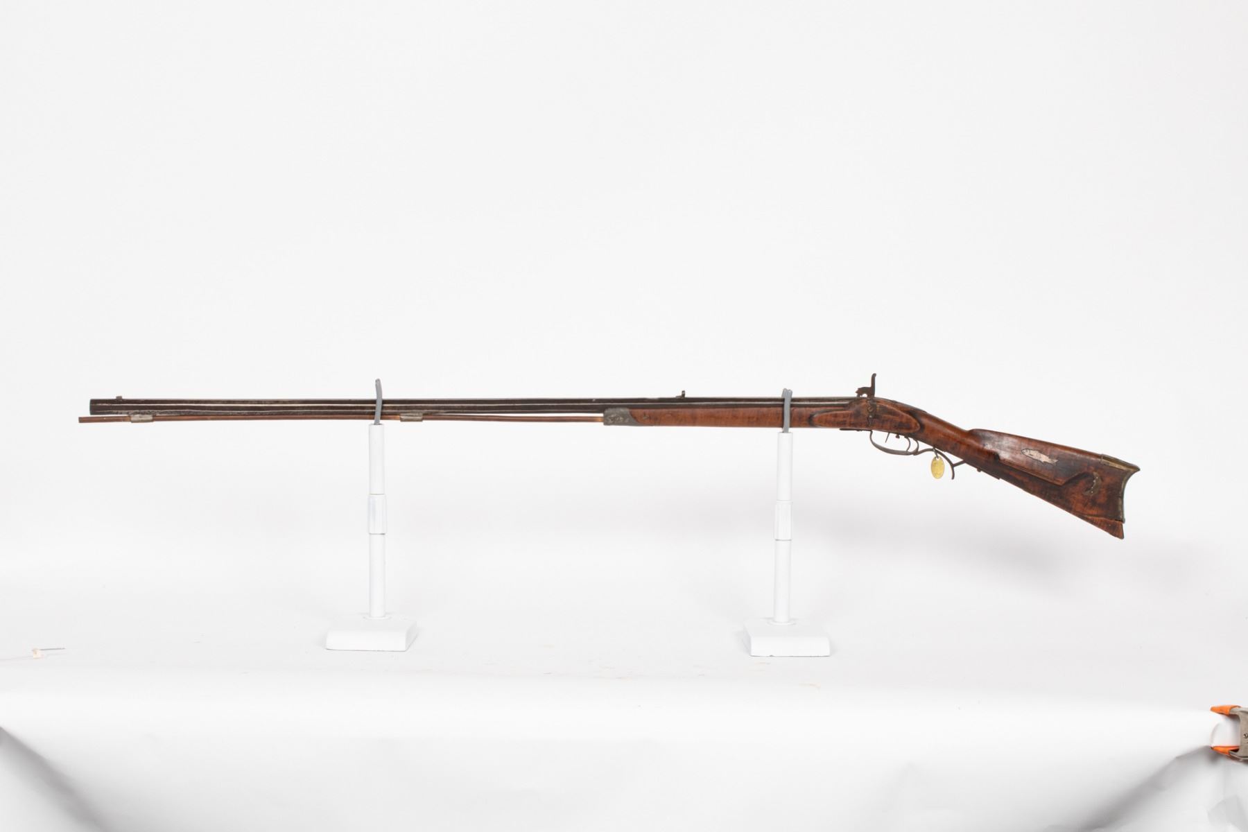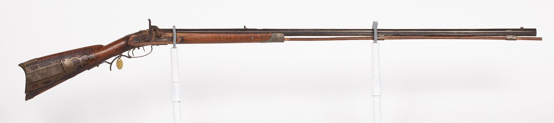 This is a Kentucky half-stock rifle in about .40 cal. with a tiger stripe maple stock . Maryland design patchbox with a dog giving chase. SN: N/A, JMD Oval Tag: 7409, Condition: Poor, >
