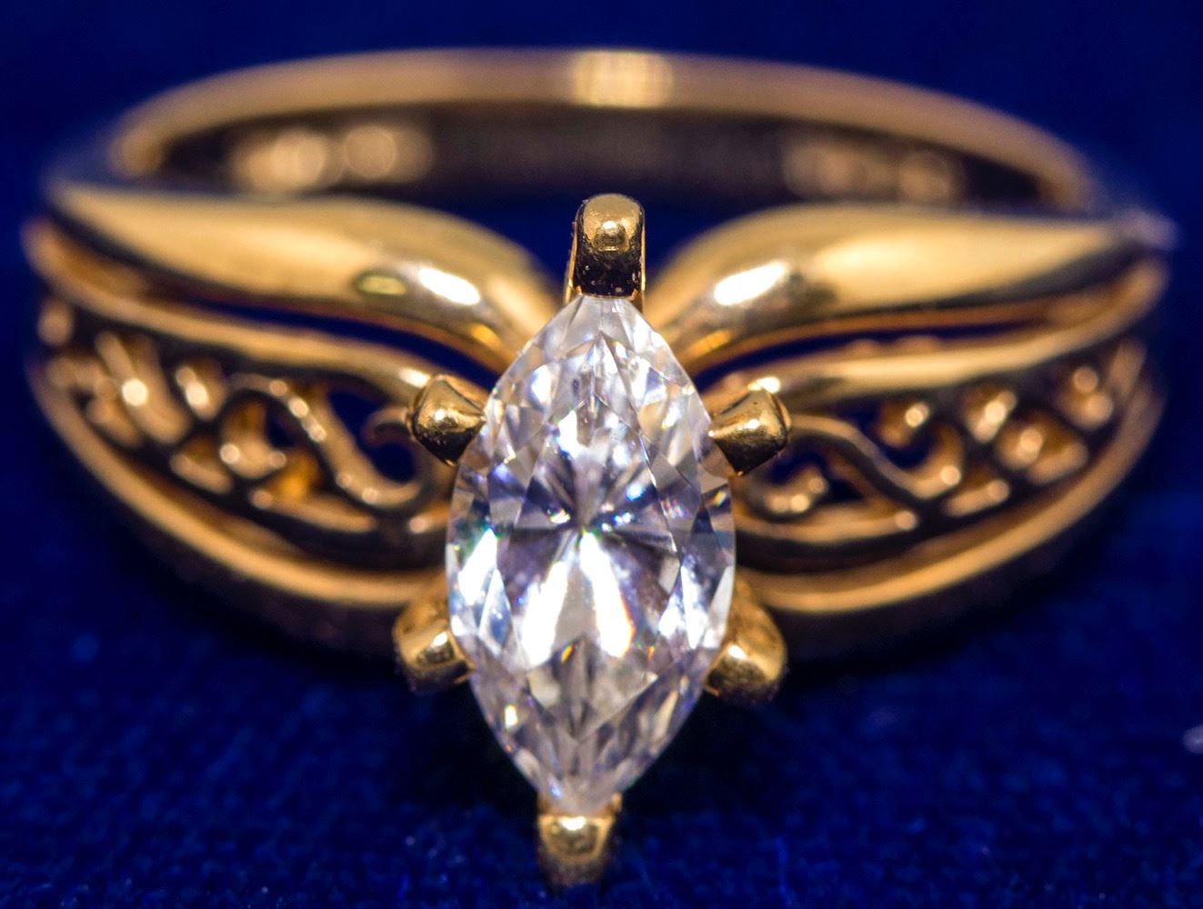 14K gold filigree, large marquise cut CZ, .15 ozs. Size 6.5. Date: Location: HWAC# 44362