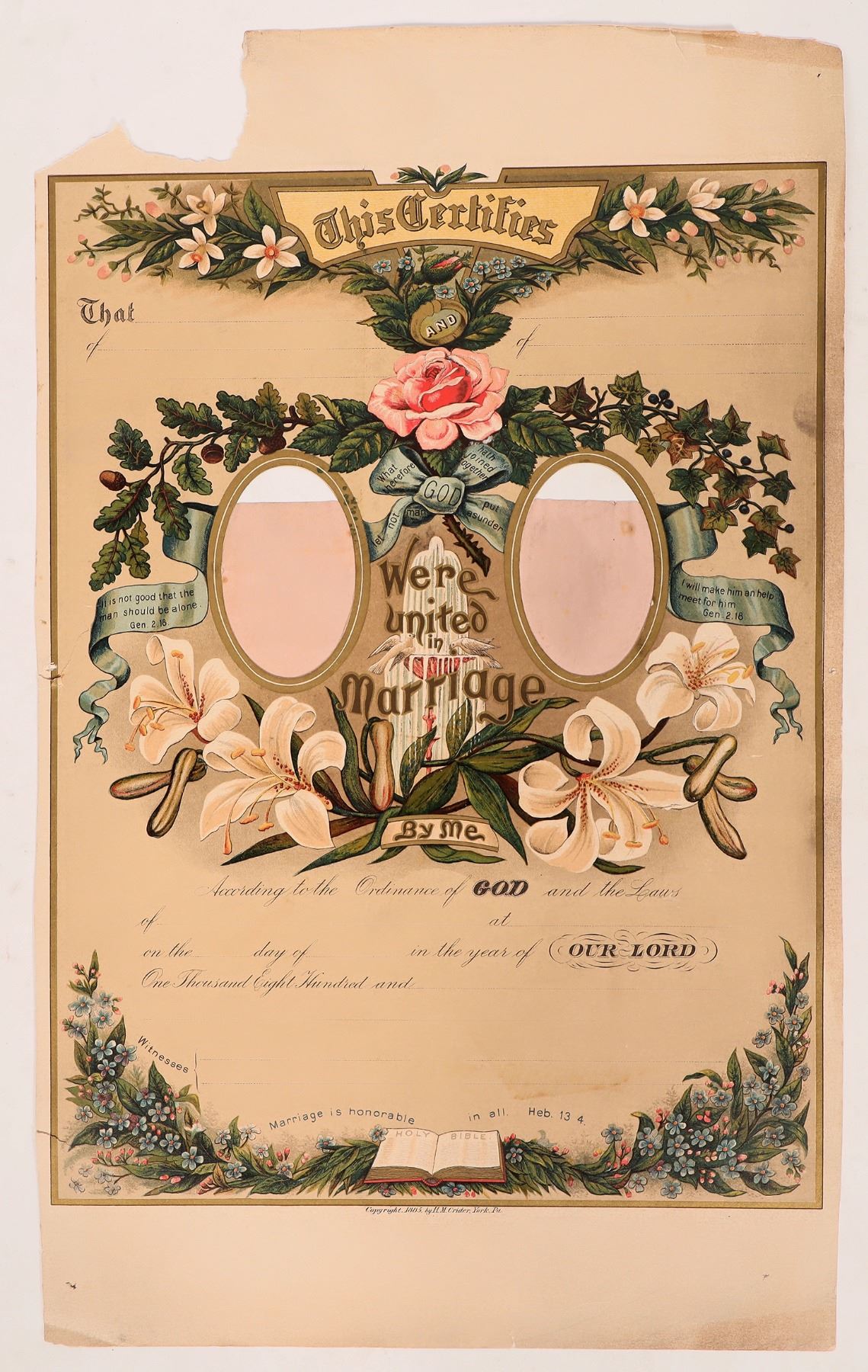 This is a display marriage certificate from 1885. It has all the lines for the JP or minister to fill out and two ovals for the happy couple's portraits. It measures 12"x 20" and is a little frayed, but that only adds to its character. Please see photos for more details.