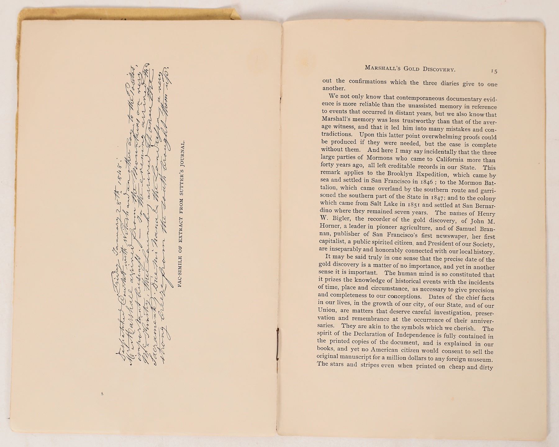 Paper delivered before the Society of California Pioneers in Pioneer Hall on the 45th anniversary of the discovery. Printed by Sterett. JW Killinger’s copy. Front cover is detached. Pages have some toning and soiling on back and front covers. Hittell was an author and historian. He was best known for his works A History of the City of San Francisco, etc. San Francisco California Franklin Collection