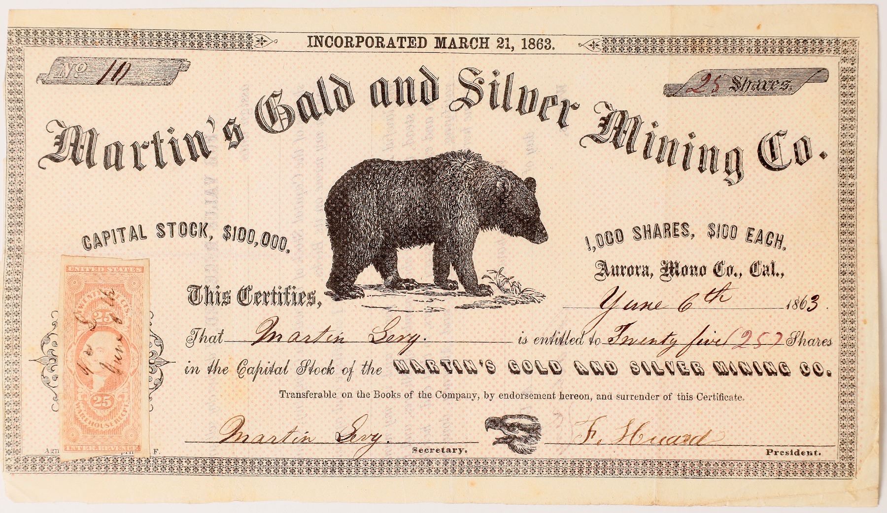 Rare. Inc. March 21st, 1863. Low number 10, issued for 25 shares to secretary Martin Levy on June 6th, 1863. Dateline Aurora, Mono Co., Cal. Signed by Levy and president F. Huard. Not cancelled. Black border and print, pink dot underprint, and vignette of bear. Imperforated red brown "Warehouse Receipt" R50 R425 cent Internal Revenue stamp attached at left. 5 x 9" Folds, creases, uneven left border. No additional information located on CDNC or newspapers.com.