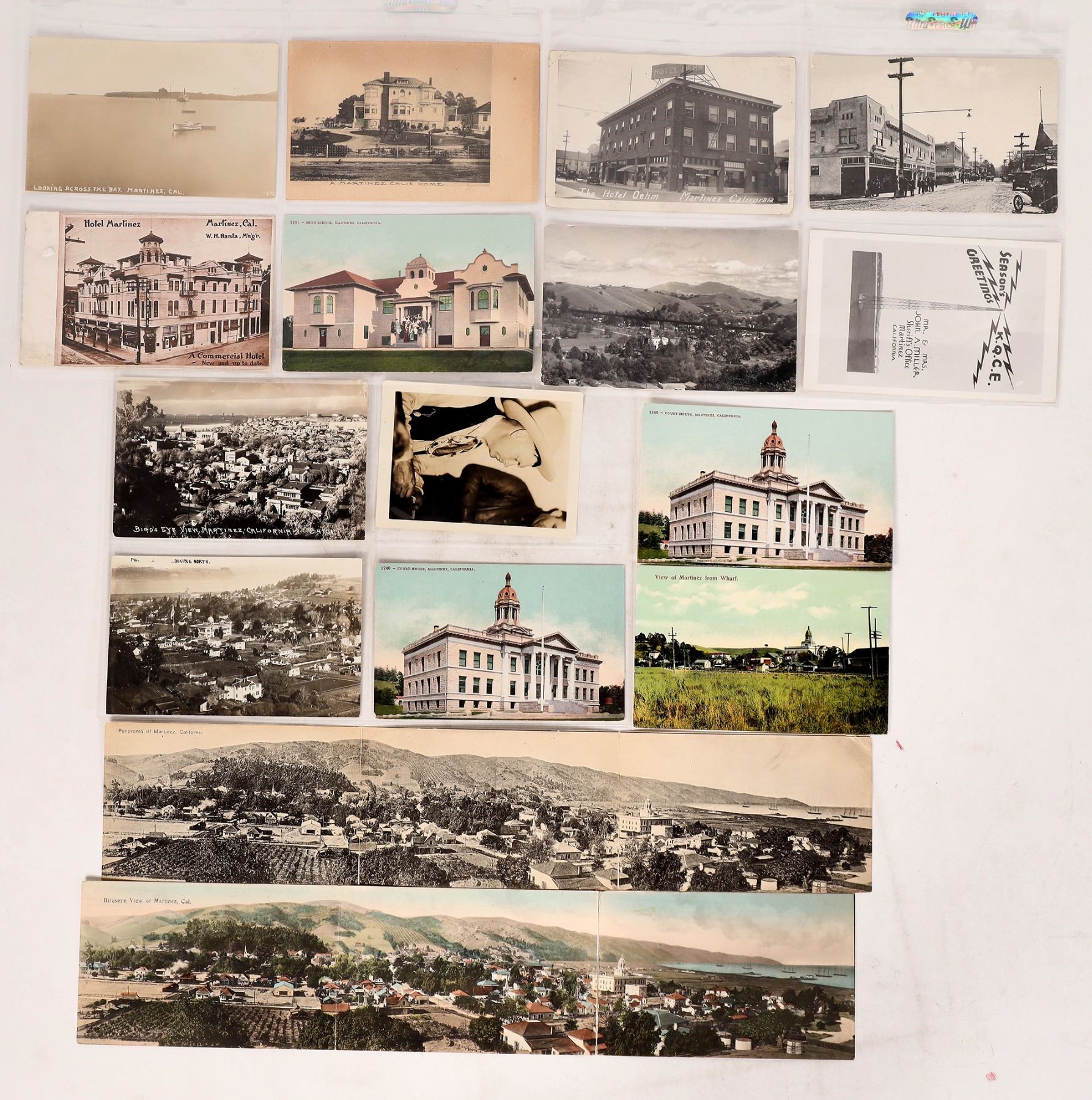 An assortment of Martinez, California postcards (16). Included a birds eye views of the city that gave baseball fans Joe DiMaggio. Also included are shots of various buildings in town, including city hall. There's also an autographed photo of former Sheriff John A. Miller, who was so proficient as a sharp and trick shooter, the bad guys didn't stay in the county long and he never had to carry a gun. Some cards are used most are blank. Please see photos for more details. Martinez California