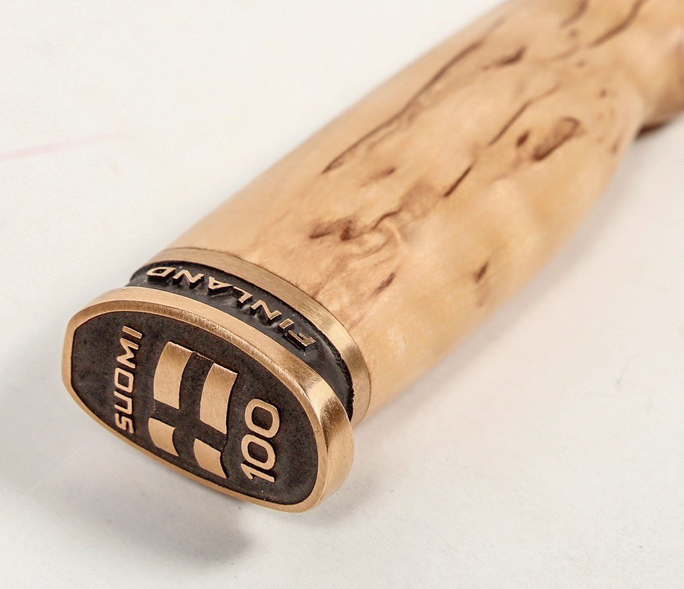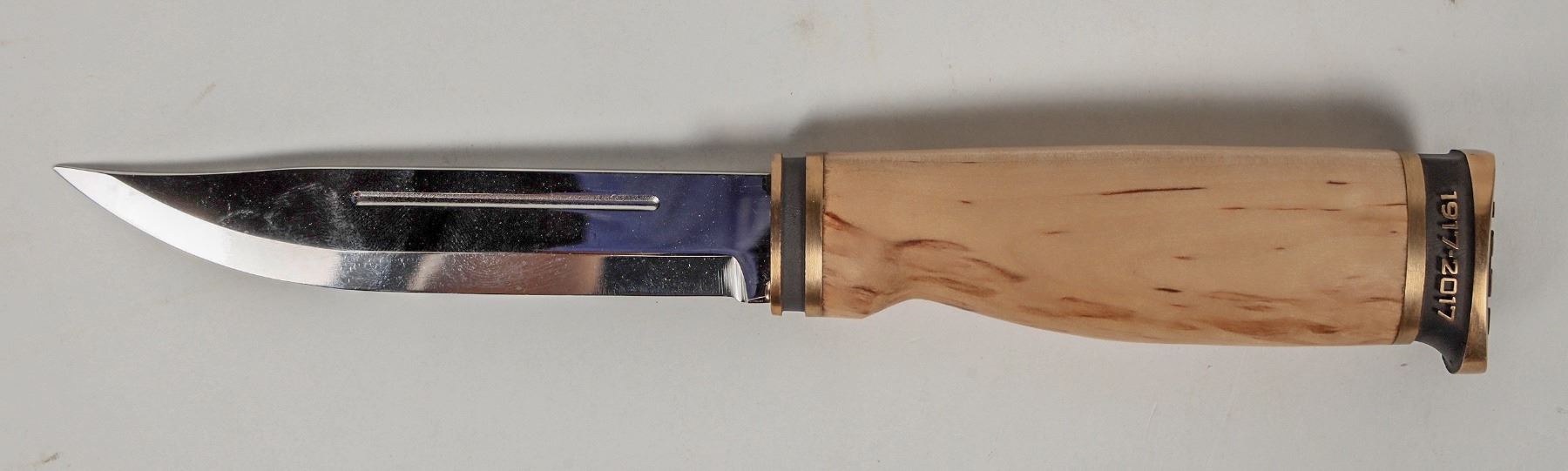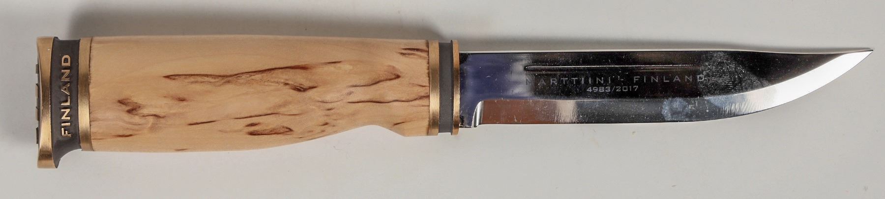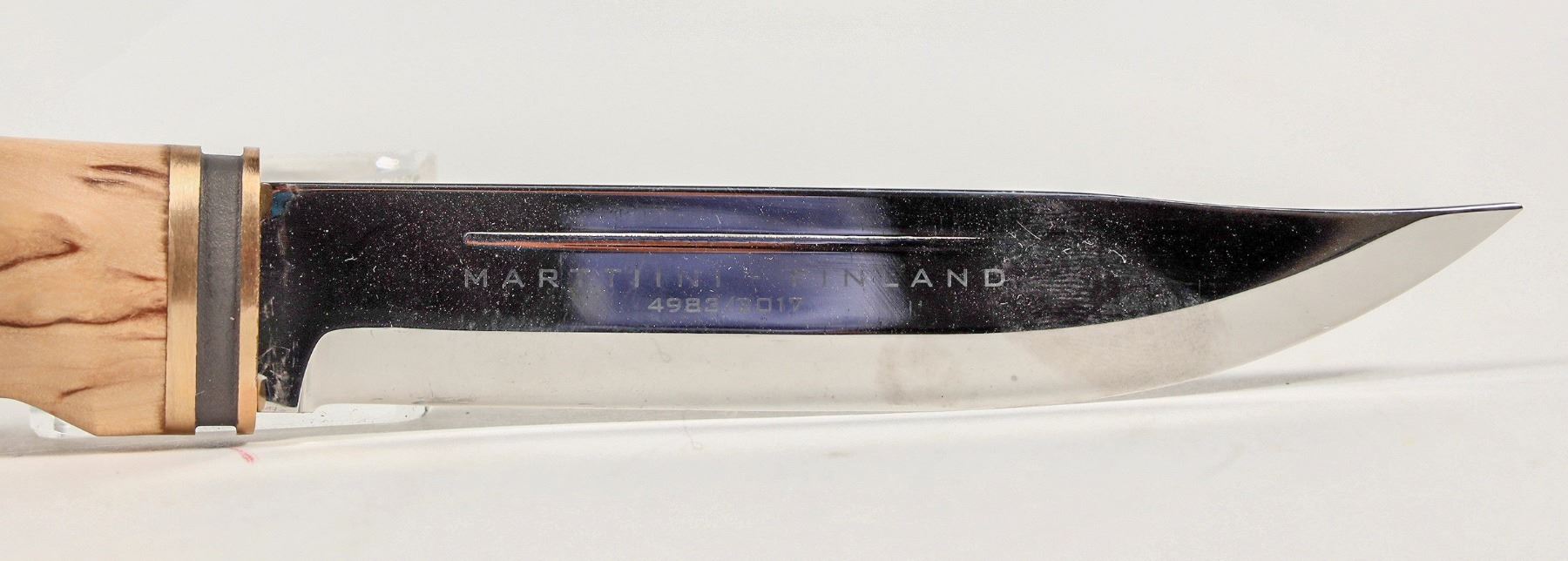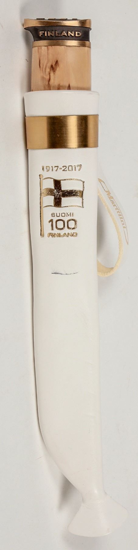 This is Marttiini-Suomi 100th anniversary sheath knife made in Finland. These knives are noted for their durability. At 8.75 in. ( 222 MM) with a stainless blade, bronze ferrules, and curly birch wood handle. Beautiful and extremely sharp. S/N 4983/2017. Complete with a white leather sheath. Please see photo for details.