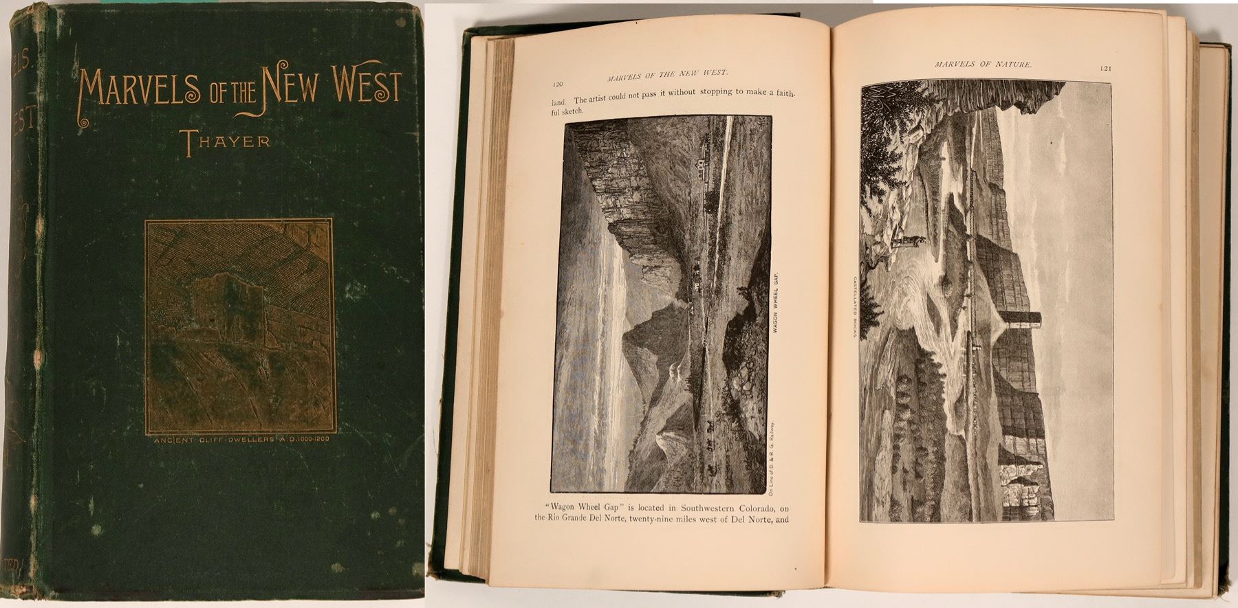 A Vivid Portrayal of Stupendous Marvels in the Vast Wonderland West of the Mississippi River. Six books in one volume. Comprising Marvels of Nature, Marvels of Race, Marvels of Enterprise, Marvels of Mining, Marvels of Stock-Raising, and Marvels of Agriculture, Graphically and Truthfully Described by William M. Thayer, Author of over twenty standard works, including "The White House Series of Biographies," and "Youths' History of the Rebellion". Illustrated with over 359 engravings and maps. Norwich, Conn.; the Henry Hill Publishing Company, 1888. 9.5" x 6.5" hard bound. 715 Pages with original binding intact. Wear to spine and edges of covers, but all inside pages present and in very good condition. Thayer's compilation of work published in this one volume provides an invaluable reference on the western continental United States in the 1800s, detailing the vast expanses of awe-inspiring landscapes, geologic features, natural wonders, the richness of mineral resources that abounded and a multitude of amazing archeological discoveries occurring throughout the 19th Century, including those evidencing advanced civilizations existing in North America prior to and concurrent with the aboriginal races of American Indians encountered by early European explorers. This fascinating work also chronicles the achievements of American innovation and the explosive progress sparking America's Industrial Revolution along with mind boggling feats of labor, craftsmanship and the sheer force of will coupled with the indomitable human spirit represented in Western American 19th century Architecture, Mining Operations, Transportation, Agriculture and the like.
