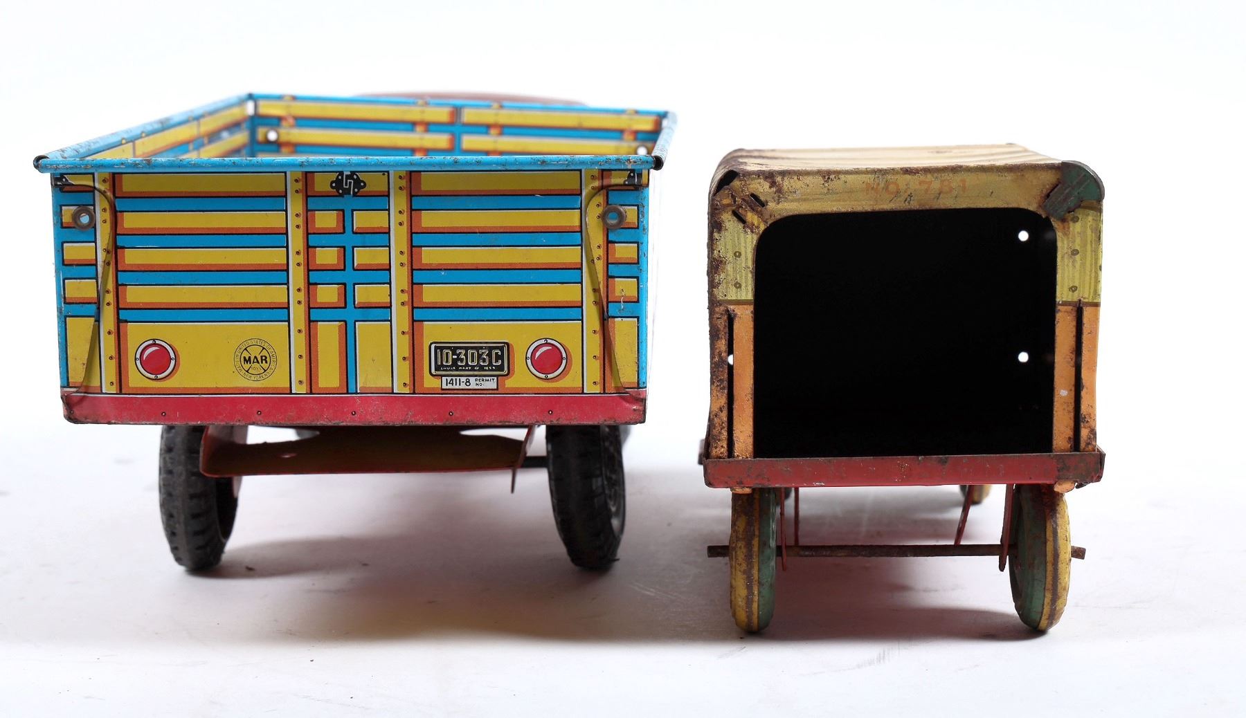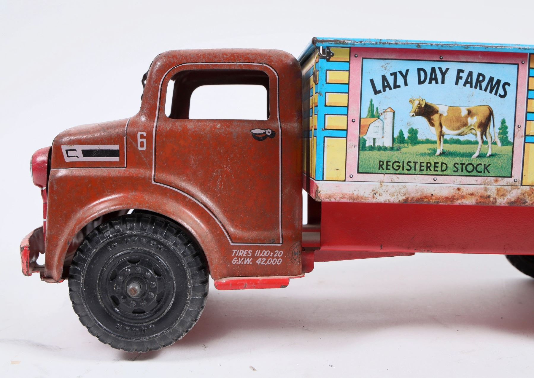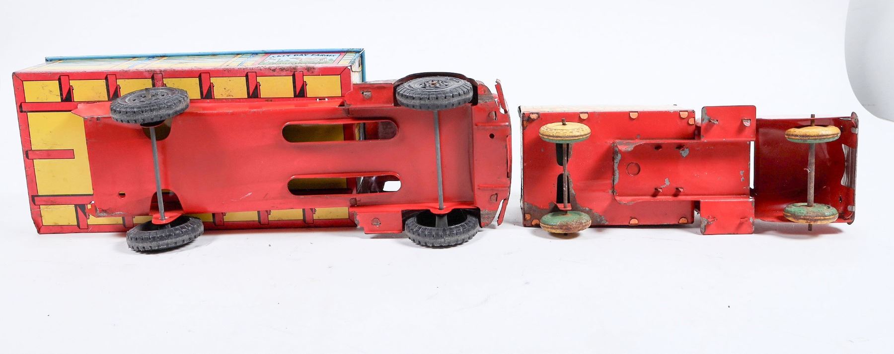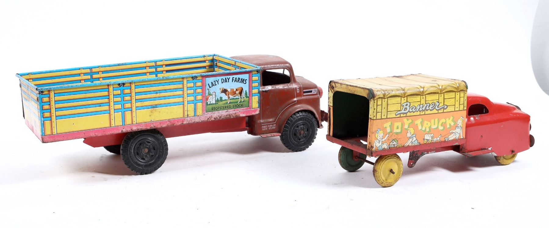 Lot of 2. Marx Lazy Dat Farms Registered Stock truck, pressed steel, red/yellow, all markings in very good condition, no dents, minor play wear, wheels in good cond. 13” L. Banner Plastic pressed steel delivery truck, red/yel., no dents, graphics on left side are in poor condition, all others are clear. approx 8”L