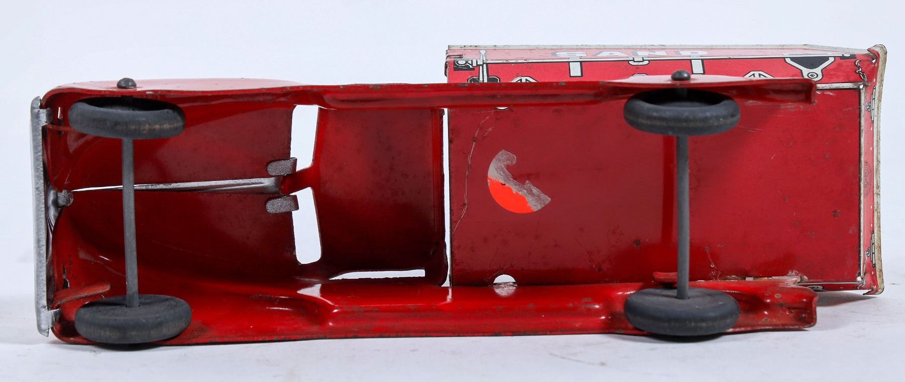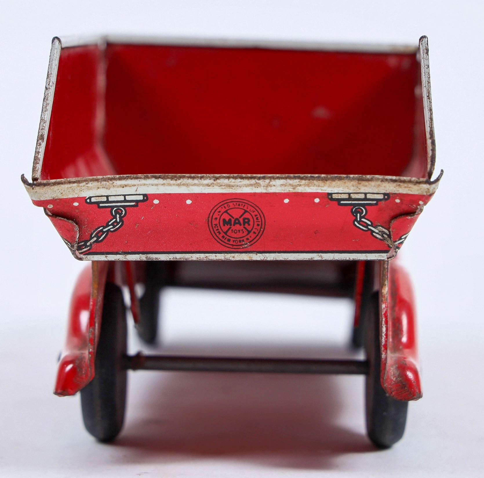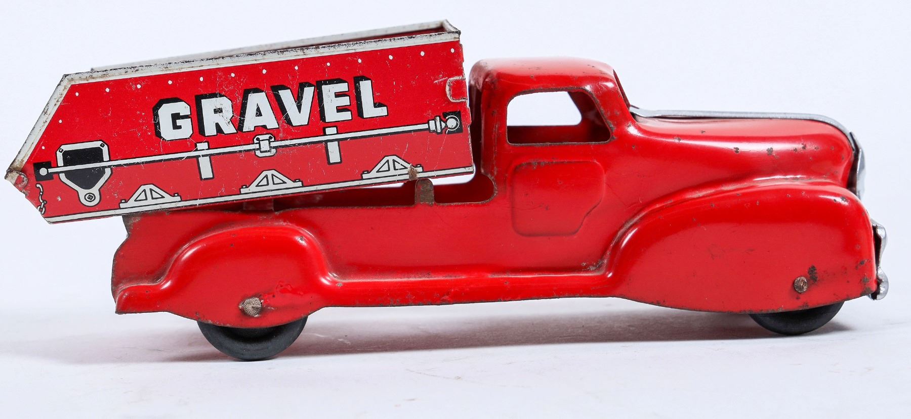 Marx Sand & Gravel Pressed Steel Dump Truck. Red. Paint and Graphics in Excellent Condition. Wheel in Excellent Condition. Extremely Rare to find in this Condition. 9x4"