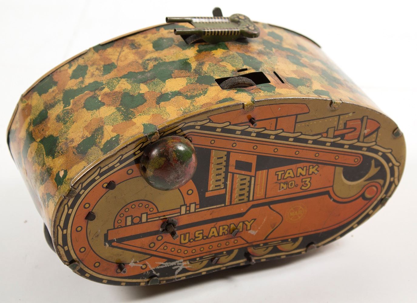 US Army Tank Corp Wind Up Turn Over Tank. The sides are marked Tank No. 3 Marx. It measures 7 3/4Ó long, 4 _Ó tall and 4 1/2" .The key still winds and the motor whirrs, but the tank doesn't seem to want to turn over. It's a collector's item from the 1940's-50's. Date: Location: HWAC# 56649