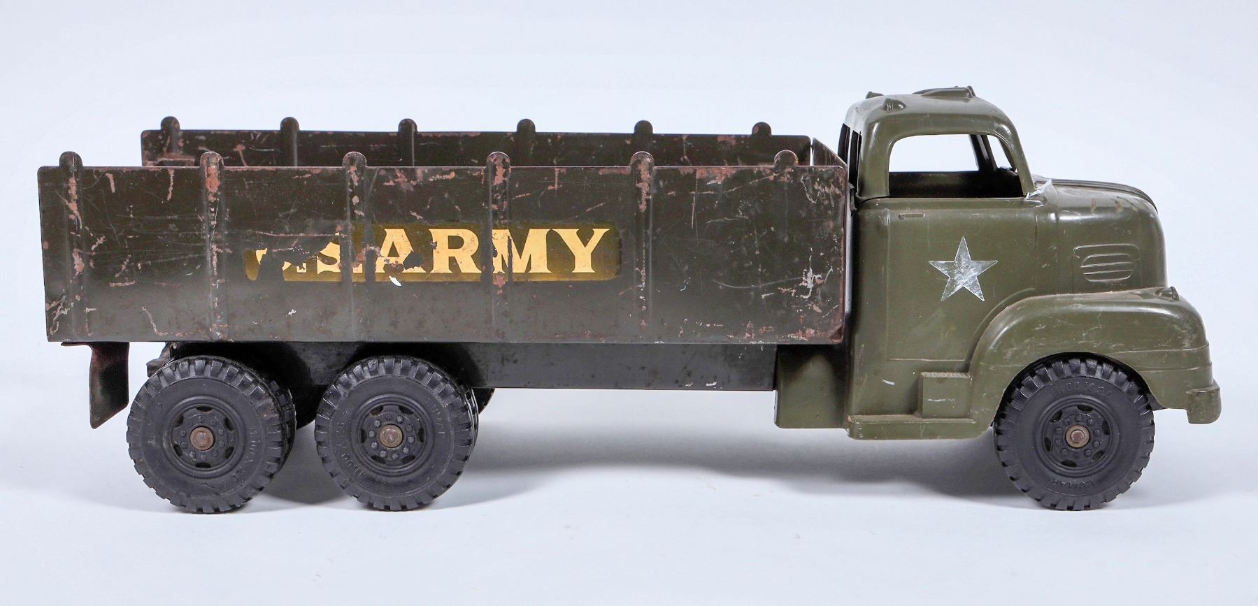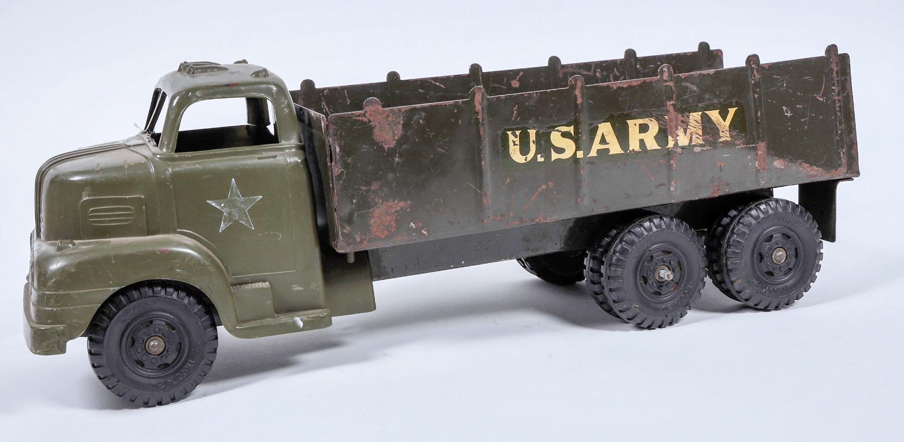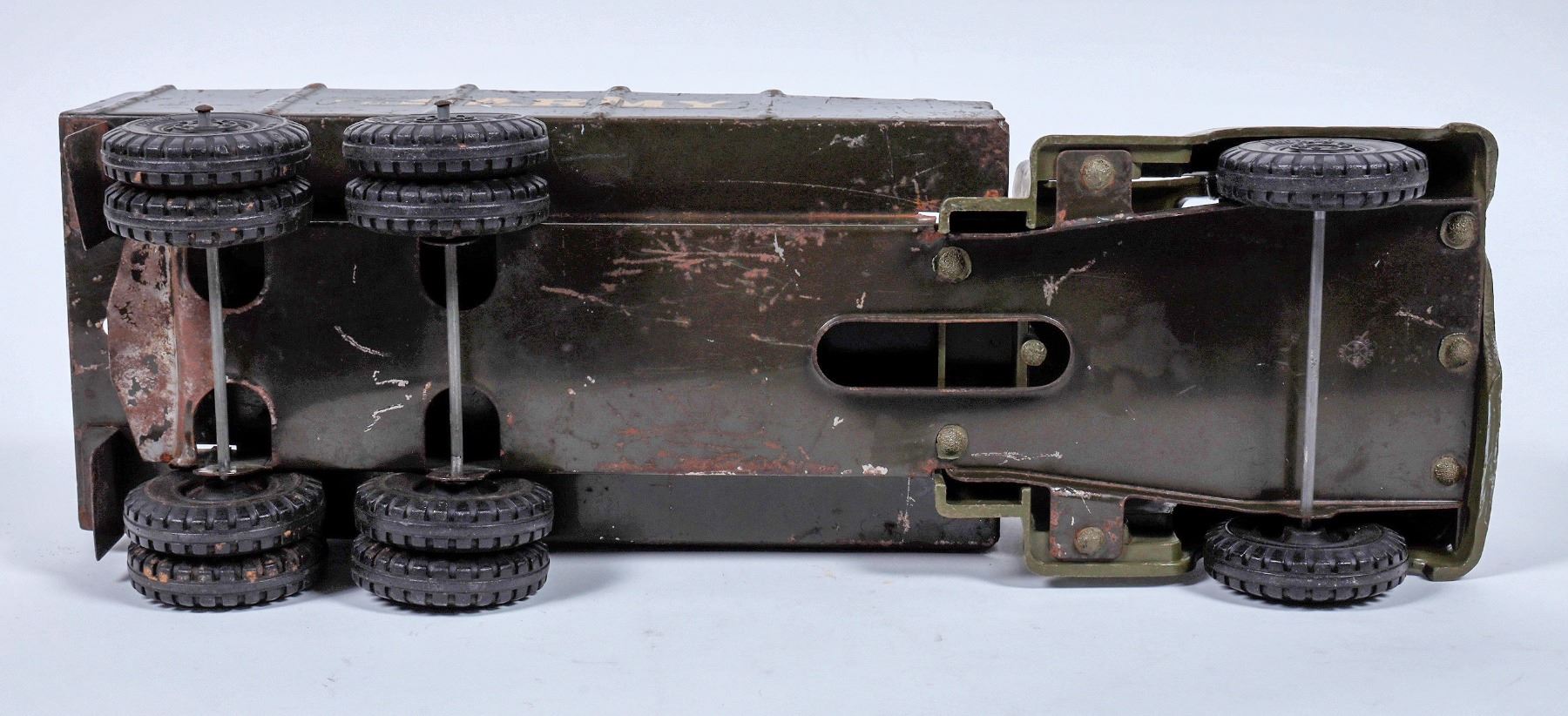 Vintage Marx U. S. Army Pressed Steel Transport , shows play wear, graphics stars on doors are faded and on bed are clear. Good condition. 20" L/