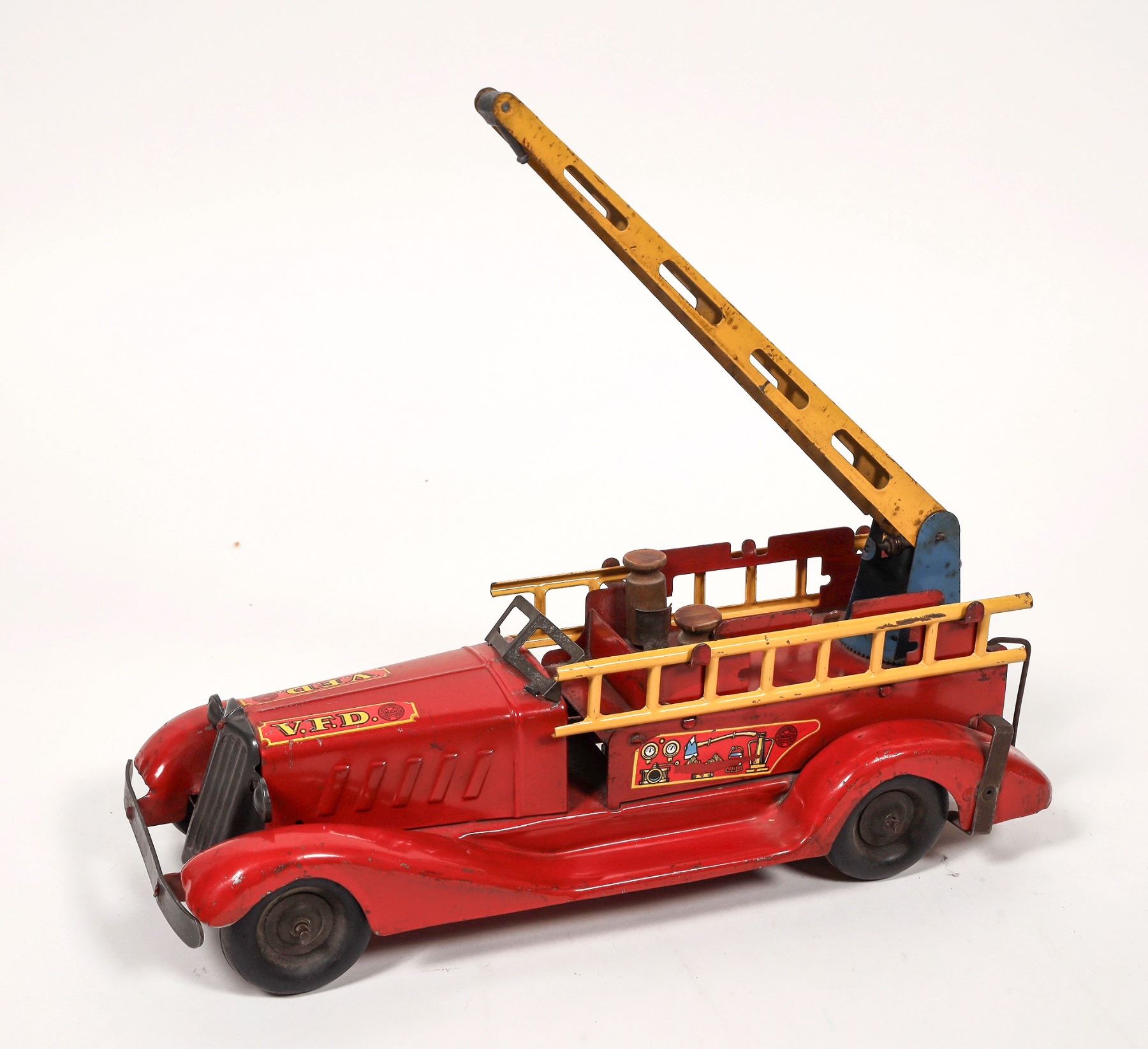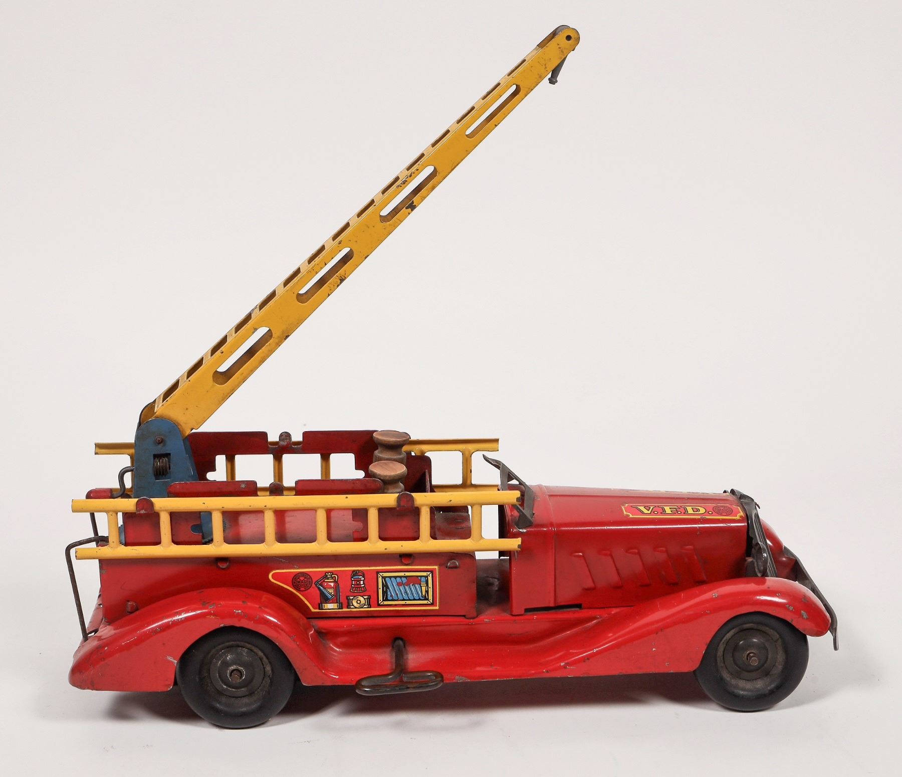 Marx pressed steel V.F.D. aerial ladder truck. This is in excellent condition Paint and decals are in complete and in tact showing very little wear for it's age. The windup works and is intact produces a siren sound when running. Ladders are on excellent condition showing almost no wear. Two wooden "cans" in holders. There may have been a fireman at he wheel, but is missing. The crank for raising the ladder/nozzle works fine. Seal on hood for Marx toys and made in United States of America. Measures 14.5 x 5 x 5". Great addition to any collection and hard to find in this condition.