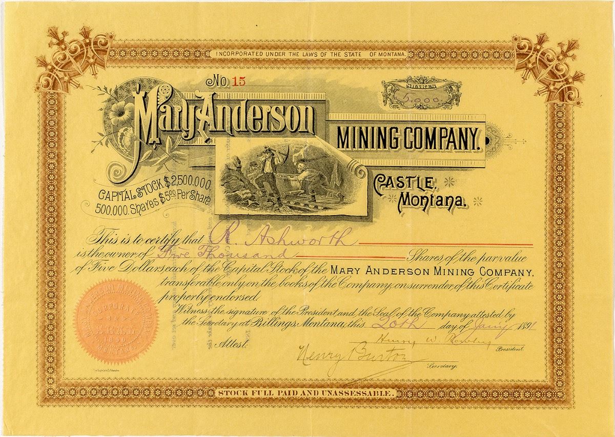 Rare. Inc. Montana. No. 15, issued for 5,000 shares to R. Ashworth on Jan. 20th, 1891. Signed by Henry W. Rowley (president) and Henry Burton (secretary). Not cancelled. Yellow paper with maroon border and vignette showing three miners and ore cart. Floral logo. Printed by The Gugler Litho Co., Milwaukee. 9" x 12.5" Folds, otherwise very nice. City: Castle Rock State: Montana Date: 1891 ID: 36646