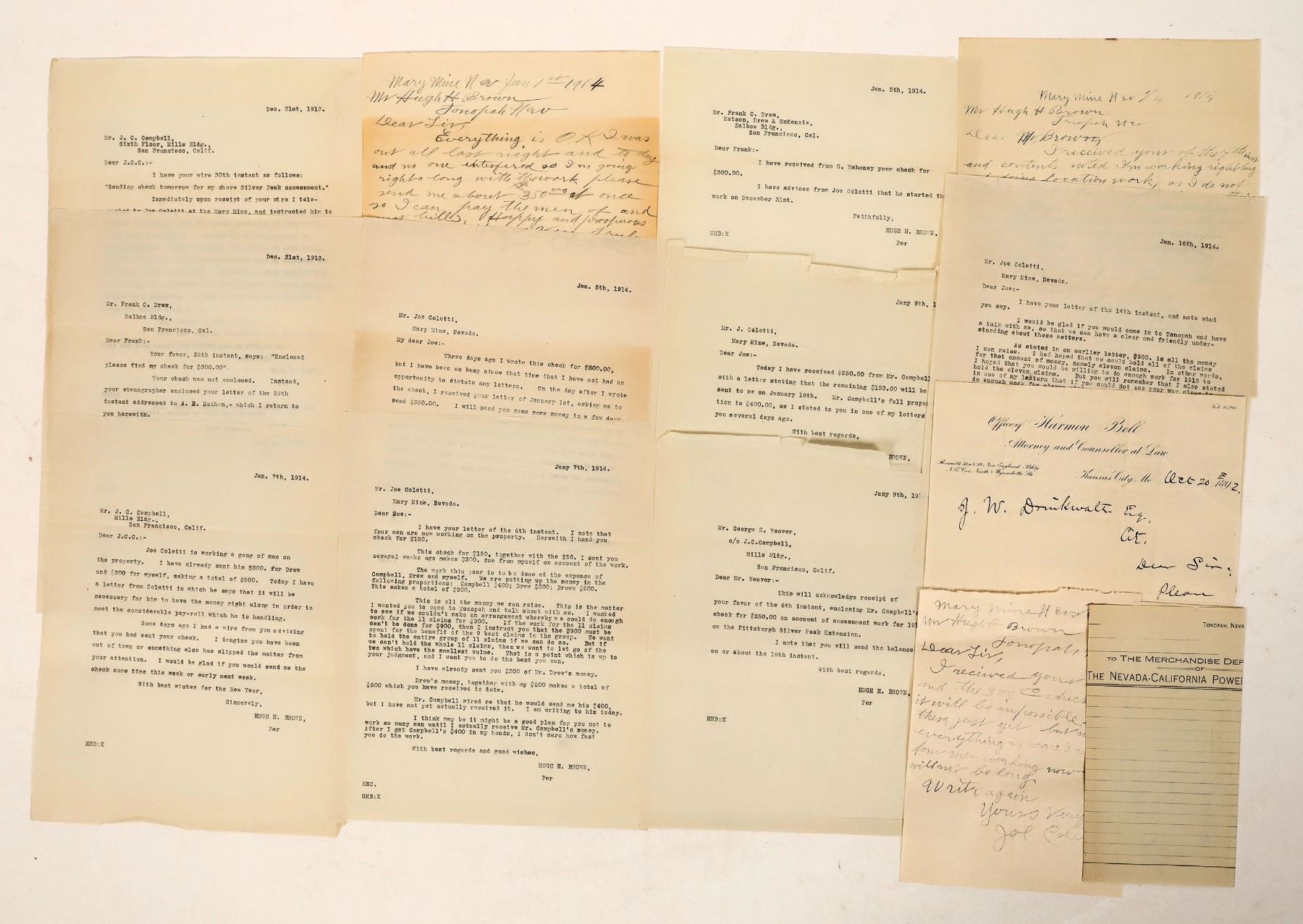 A collection of correspondence related to the Mary Mine of Silver Peak, Nevada, dating from 1892 to 1914. The collection contains eleven letters, mostly typewritten with a few handwritten. Most letters are regarding the transfer of money. One letter is from J.W. Drinkwater, likely related to the Drinkwater section of the Mary Mine. Some letters have wear around the edges consistent with age, but all are legible and in good condition.