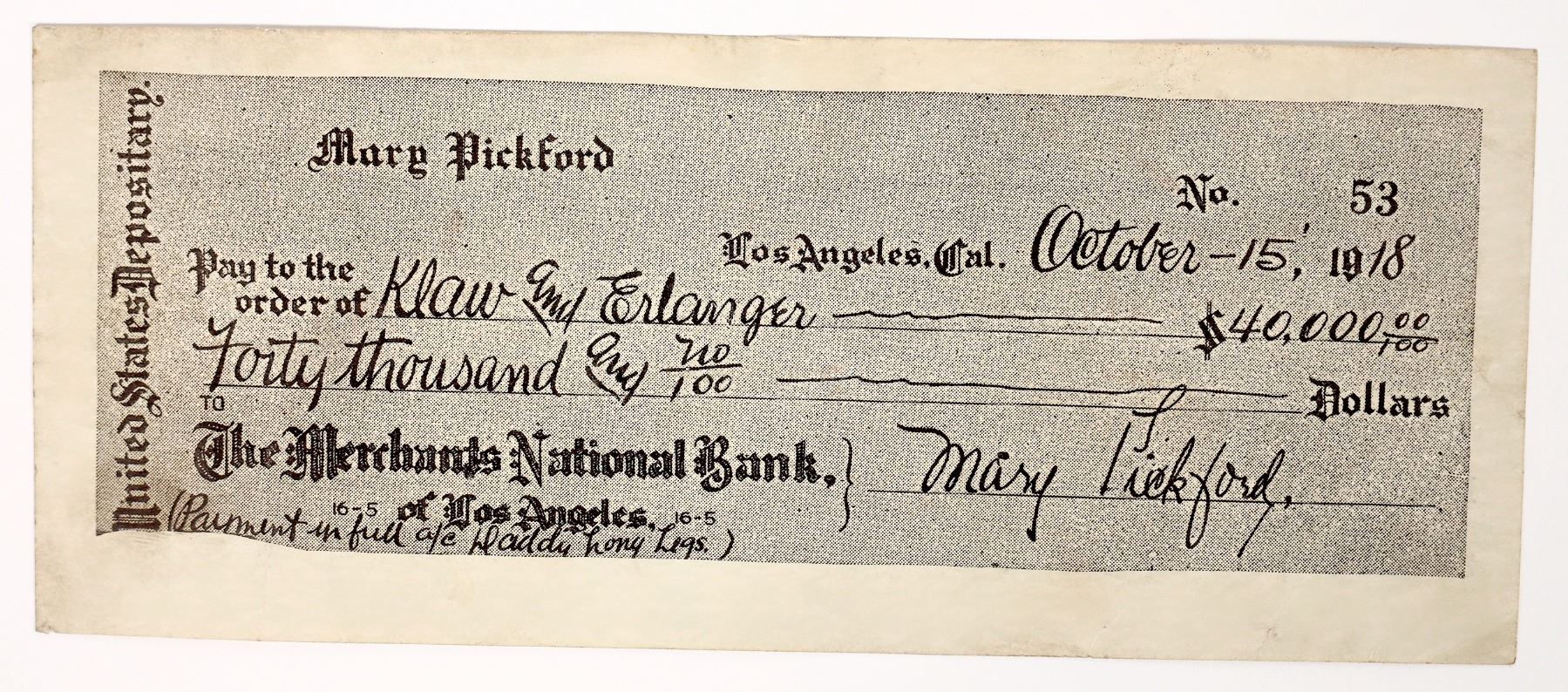A reproduction of the $40,000 check Mary Pickford paid to Klaw and Erlanger for the film rights of the story: "Daddy Long Legs." The film was shown at Loew's Valentine Theatre, Toledo, Ohio. A hand written invitation from the actress: My dear friends of the Loew Theatres. This is a reproduction of my check in payment for the story "Daddy Long Legs." I believe it is worth every cent of the money and think the picture is better than "Tess of the Storm Country," Stella Maris," or "Rebecca of Sunnybrook Farm." "Daddy Long Legs," is my first very own photoplay from my own studio and I do hope you'll like it. Sincerely yours, Mary Pickford.