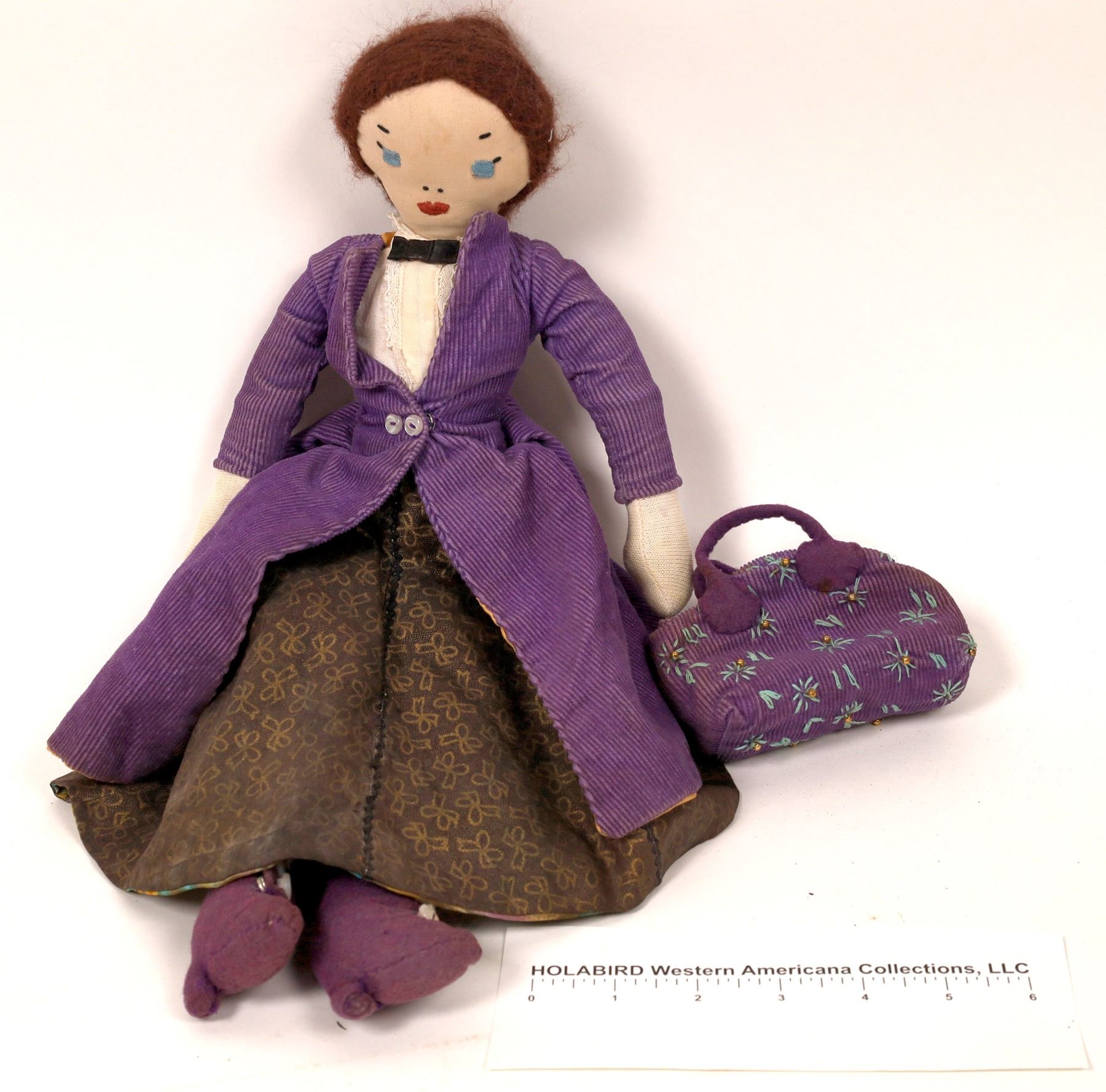 This is a unique folk art doll depicting P.L. Travers iconic character Mary Poppins. Travers wrote a series based on her magical nanny from 1934 to 1988. Walt Disney added to the character's fame with a film in 1964. This doll measures 16" tall and is dresses in skirt, blouse and corduroy frock coat. Although she's missing her hat and umbrella, she does have her large carpet bag satchel.