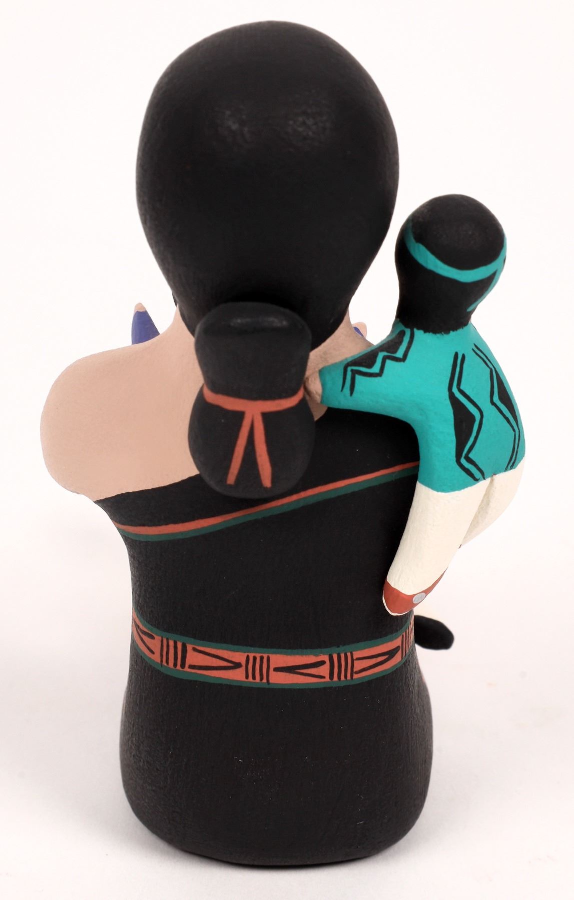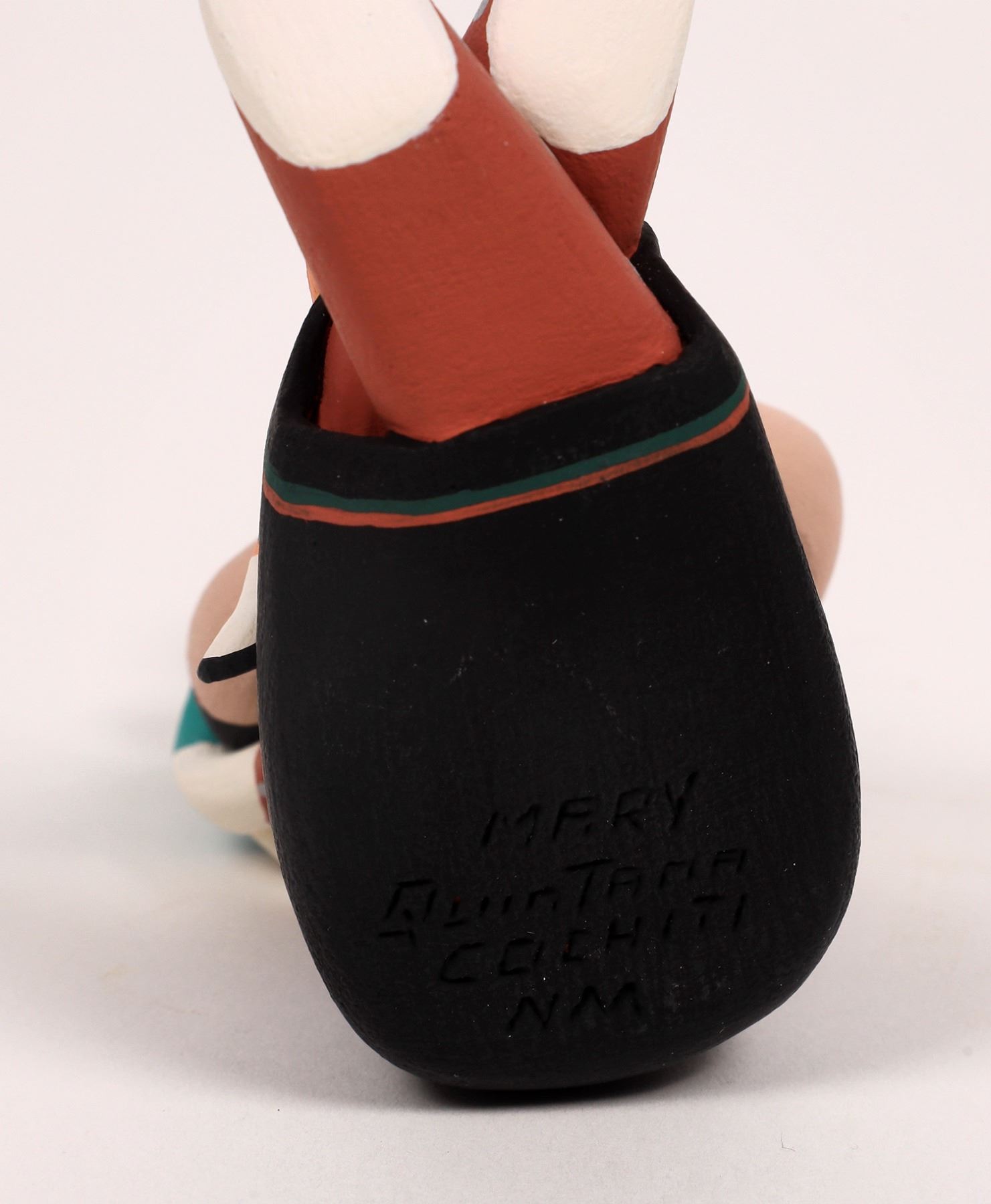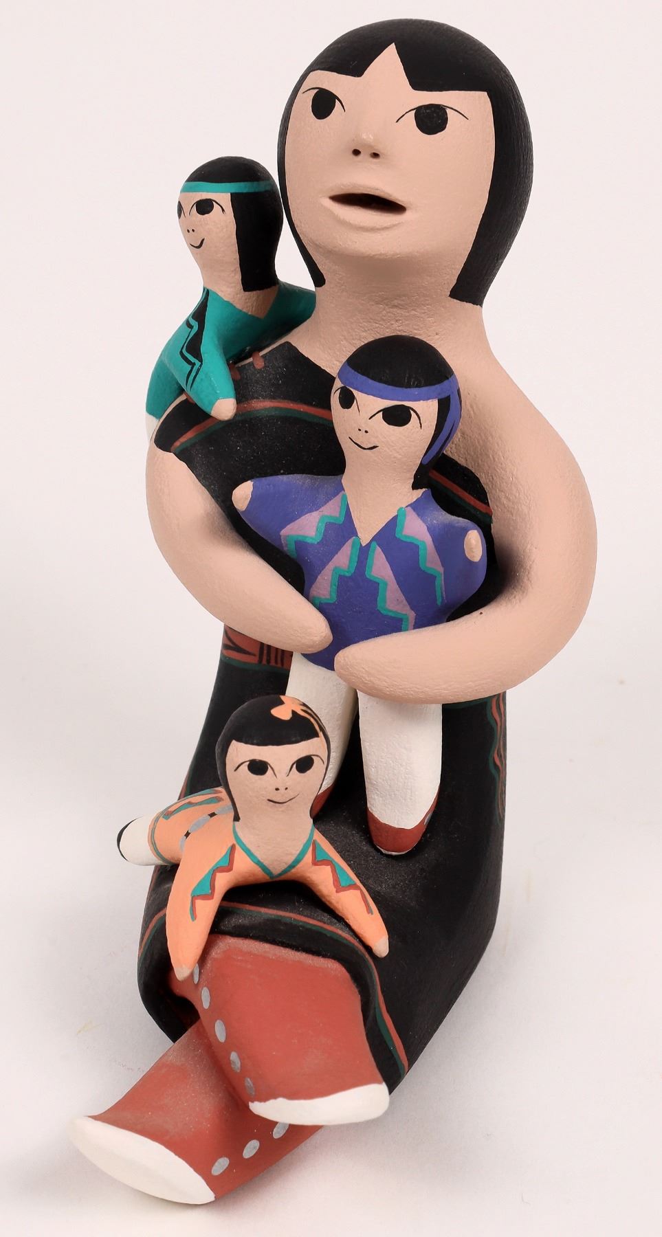 Storyteller with three children by Mary Quintana (Cochiti). Mary continues to make storytellers, clay sculptures and nativities in the traditional hand-made methods of her ancestors. In her unique style, and in exception to tradition, are her brilliant colors that are painted with acrylic paints. 4.5" x 2.5".