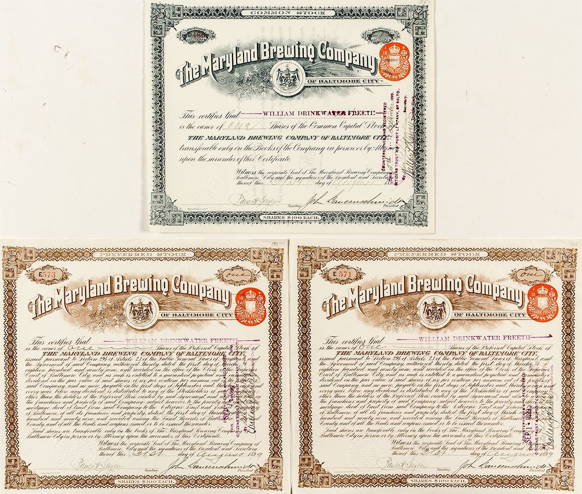 Three certificates, two types. All issued in 1899 to the same person, William Drinkwater Freeth. Signed by the president and secretary. Not cancelled. Each has either a black or brown border and floral logo. Three pence revenue imprint on each. 9" x 10.75" and 10" x 11.75" Printed by Guggenheimer, Weil & Co., Baltimore. (Prag Collection) City: Baltimore City State: Maryland Date: 1899 hwac# 34661