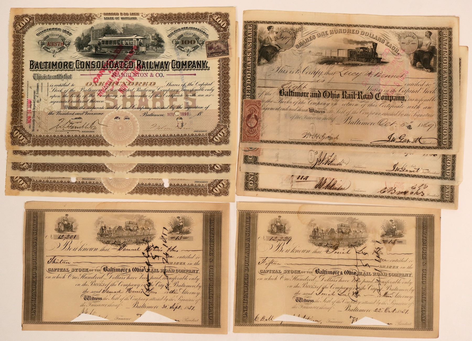 10 certificates. 1. 6 Baltimore and Ohio Railroad Co. incorp. 1827. Four IC, 10 shares issued 1856 signed , Black, vignette early 4-4-0 l-r females in top corners, Toppan, Carpenter, Casilear & Co printer. Two, I/C, issued 1851, signature cut out, vignette top early cab less train r-l females in corners. Revenue stamps. Toppan, Carpenter, Casilear & Co printer 2. Four Baltimore Consolidated Railway Co. incorp. 1897. , I/C, 100 shares issued 1898 signed (unreadable), Brown, embossed seal, vignette electric street ar l-r, 100 SHARES underprint, revenue stamp. Franklin Bank Note Co.
