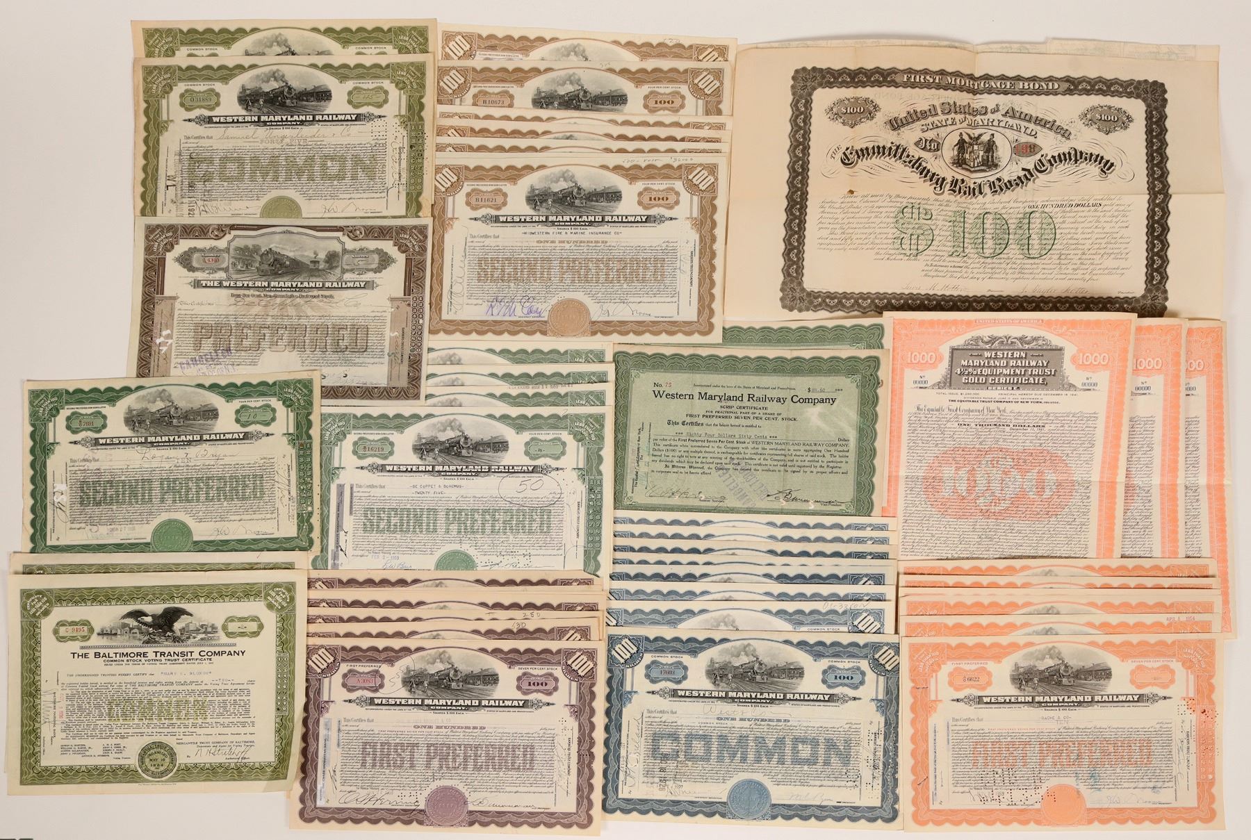 1. 44 total certificates. 3 Specimen Western Maryland Railway 4 1/2% Equipment Trust Gold Bond Certificates; all three are in very good condition; vibrant orange color. 2 are signed and canceled; illegible signatures from the assitant secretary and the vice-president; both are canceled via hole punch; both in good condition, some discoloration. 39 are signed and canceled via hole punch; illegible signatures from the assistant secretary and vice president, all in very good condition, some discoloration. 2. Emmittsburg Railroad Co $100, 1st Mortgage Gold Bond, 1874 - 1st mortgage bond, issued in 1874. Cert. #198. 30 year bond at 6%. State seal vignette. Small hole left of center. Fold lines. 3. Baltimore Transit Company Stocks and Bonds (14) - Lot includes three common stocks issued in the 1950's, three Voting Trust certificates issued in the 1930's, cxled., and 8 various bonds mostly issued i n1935.