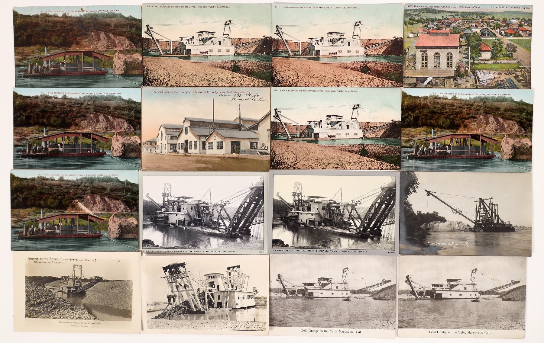 Lot of 16. Three RPC's. Mostly borderless. Postmarks: Marysville, Hammonton, Minneapolis MN, Marion OH. , one 1 cent Franklin stamp does not appear to be cancelled. Several cards depicting gold dredging along the Yuba-Sacramento-Feather rivers, "Marion Dredge No. 1", Yuba Construction Co shop dredge building. Birdseye 1910 view of Hammonton "The Dredger Town". All in protective sleeves. California Marysville Ken Prag Collection