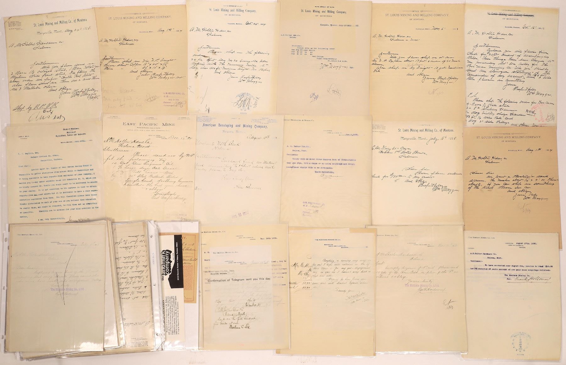 Approximately ninety (90) letterheads connected with mines in the Marysville Mining District in Montana. Included letterheads are from The Rose Densmore Mine, St. Louis Mining & Milling Company, The Montana Mine Company LTD and more. Please see photos for more detail and condition.